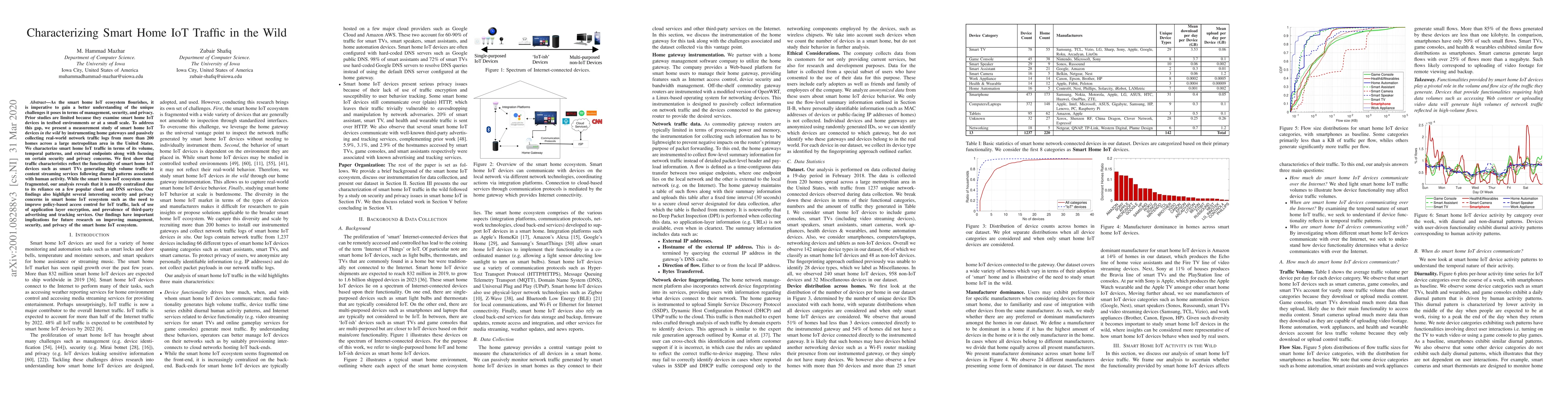 This study characterizes smart home IoT traffic from over 200 homes, revealing high-volume traffic patterns tied to device functionality and centralized reliance on popular cloud services. It highlights significant security and privacy concerns, including inadequate access control and the use of third-party tracking services.