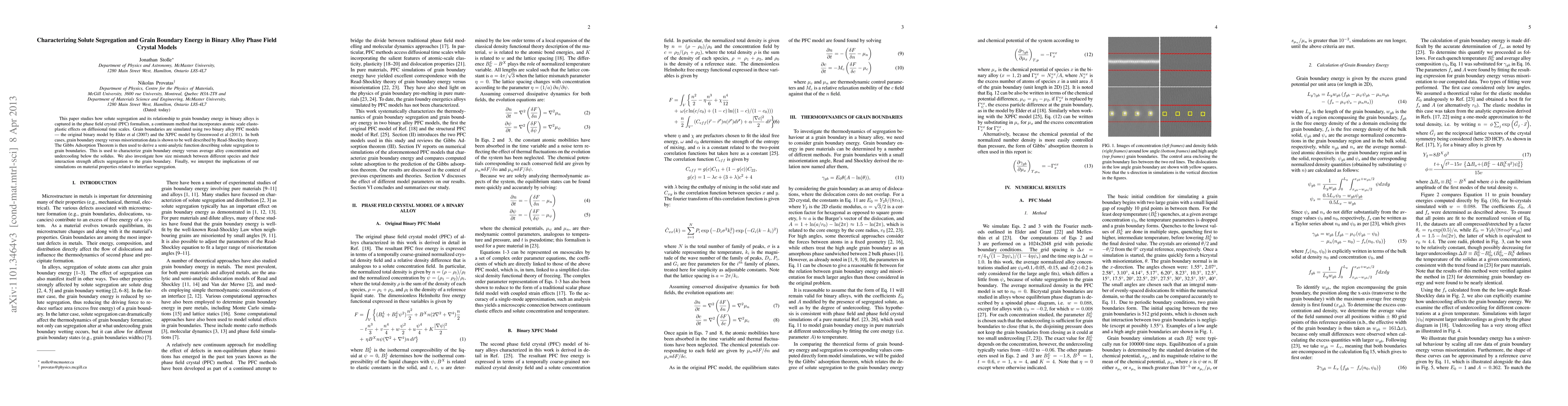 This paper examines solute segregation and its impact on grain boundary energy in binary alloys using phase field crystal (PFC) models, demonstrating alignment with Read-Shockley theory and analyzing how size mismatch and interaction strength influence segregation. The study concludes with implications for material properties due to interface segregation.