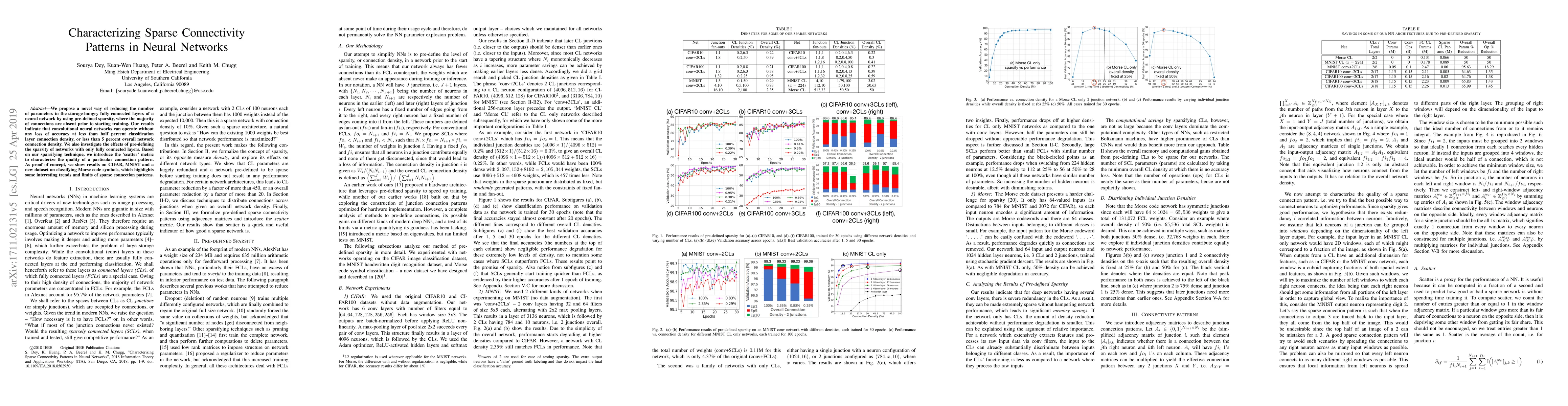 We propose a novel way of reducing the number of parameters in the storage-hungry fully connected layers of a neural network by using pre-defined sparsity, where the majority of connections are absent prior to starting training. Our results indicate that convolutional neural networks can operate without any loss of accuracy at less than half percent classification layer connection density, or less than 5 percent overall network connection density. We also investigate the effects of pre-defining the sparsity of networks with only fully connected layers. Based on our sparsifying technique, we introduce the `scatter' metric to characterize the quality of a particular connection pattern. As proof of concept, we show results on CIFAR, MNIST and a new dataset on classifying Morse code symbols, which highlights some interesting trends and limits of sparse connection patterns.