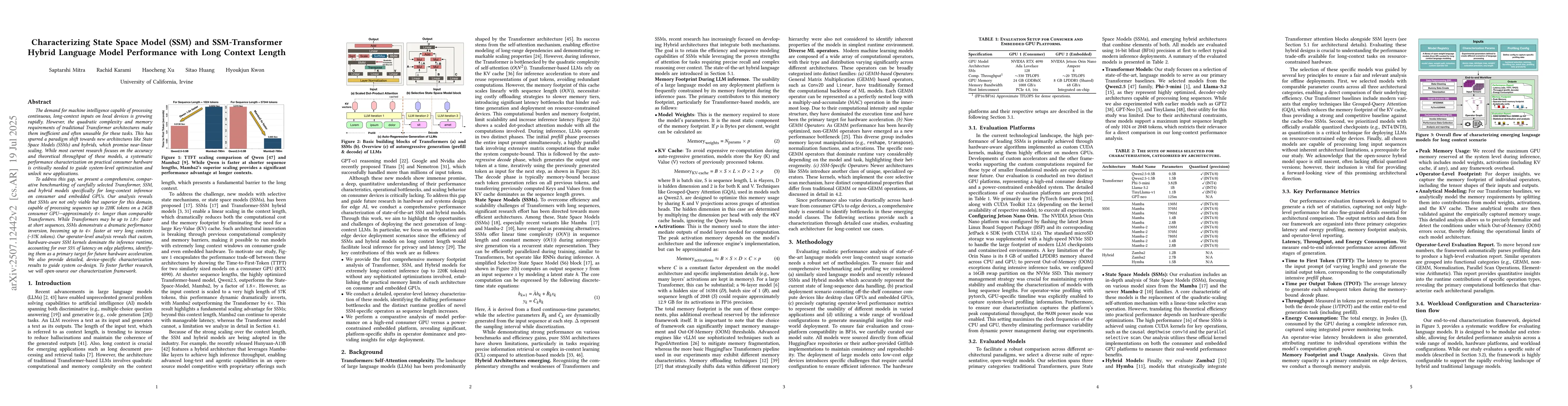 The demand for machine intelligence capable of processing continuous, long-context inputs on local devices is growing rapidly. However, the quadratic complexity and memory requirements of traditional Transformer architectures make them inefficient and often unusable for these tasks. This has spurred a paradigm shift towards new architectures like State Space Models (SSMs) and hybrids, which promise near-linear scaling. While most current research focuses on the accuracy and theoretical throughput of these models, a systematic performance characterization on practical consumer hardware is critically needed to guide system-level optimization and unlock new applications. To address this gap, we present a comprehensive, comparative benchmarking of carefully selected Transformer, SSM, and hybrid models specifically for long-context inference on consumer and embedded GPUs. Our analysis reveals that SSMs are not only viable but superior for this domain, capable of processing sequences up to 220K tokens on a 24GB consumer GPU-approximately 4x longer than comparable Transformers. While Transformers may be up to 1.8x faster at short sequences, SSMs demonstrate a dramatic performance inversion, becoming up to 4x faster at very long contexts (~57K tokens). Our operator-level analysis reveals that custom, hardware-aware SSM kernels dominate the inference runtime, accounting for over 55% of latency on edge platforms, identifying them as a primary target for future hardware acceleration. We also provide detailed, device-specific characterization results to guide system co-design for the edge. To foster further research, we will open-source our characterization framework.