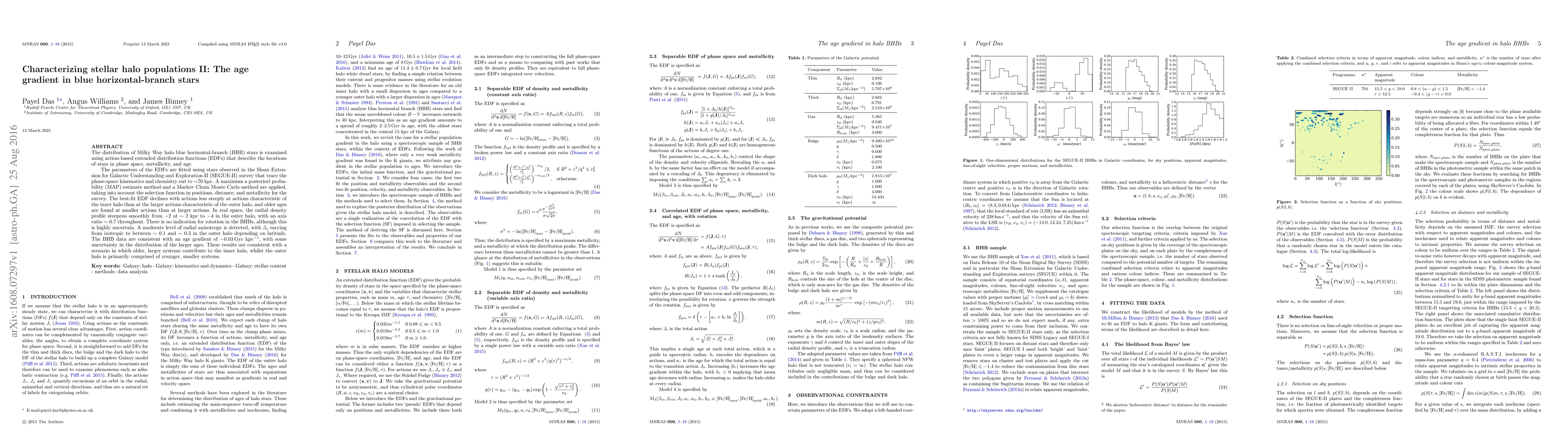 This paper characterizes the age gradient in Milky Way halo blue horizontal-branch stars using action-based extended distribution functions fitted to SEGUE-II survey data. The study finds an age gradient of -0.03 Gyr kpc$^{-1}$, indicating older stars in the inner halo and younger stars in the outer halo, consistent with a scenario of different stellar populations contributing to the halo's structure.