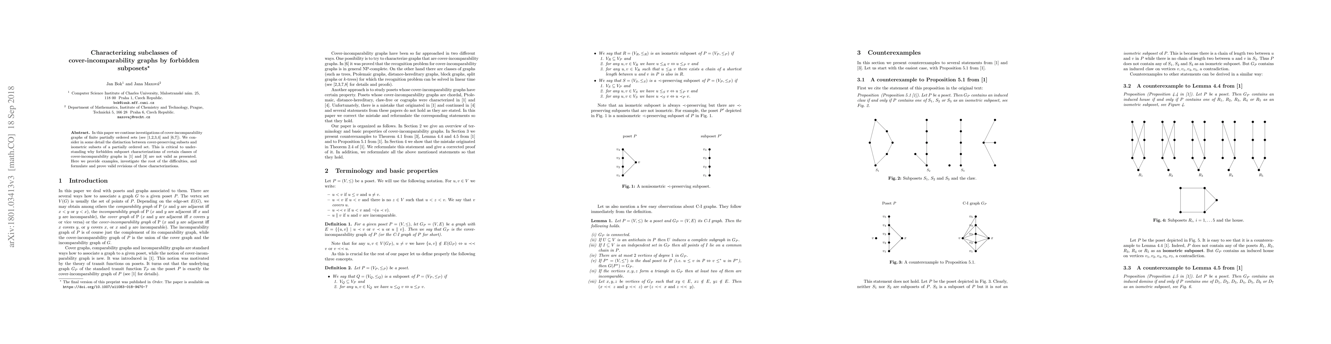 In this paper we continue investigations of cover-incomparability graphs of finite partially ordered sets (see \cite{Bres,Bres2,Bres3,Bres4} and \cite{Max,MaxDH}). We consider in some detail the distinction between cover-preserving subsets and isometric subsets of a partially ordered set. This is critical to understanding why forbidden subposet characterizations of certain classes of cover-incomparability graphs in \cite{Bres} and \cite{Bres3} are not valid as presented. Here we provide examples, investigate the root of the difficulties, and formulate and prove valid revisions of these characterizations.