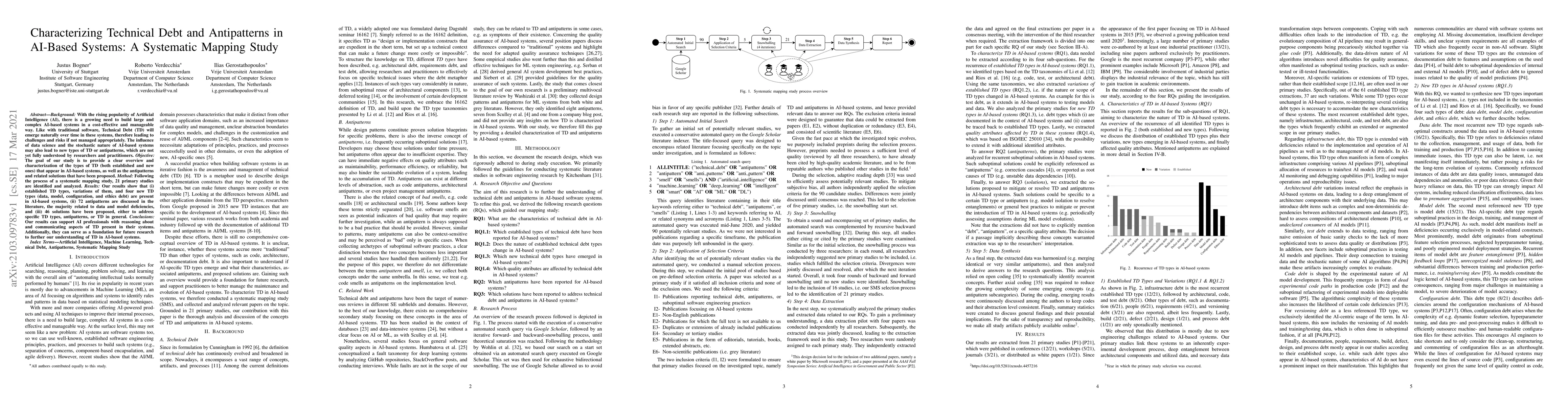 A systematic mapping study identifies 4 new types of technical debt in AI-based systems and 72 antipatterns, with solutions proposed to address them, providing a foundation for future research on technical debt in AI.