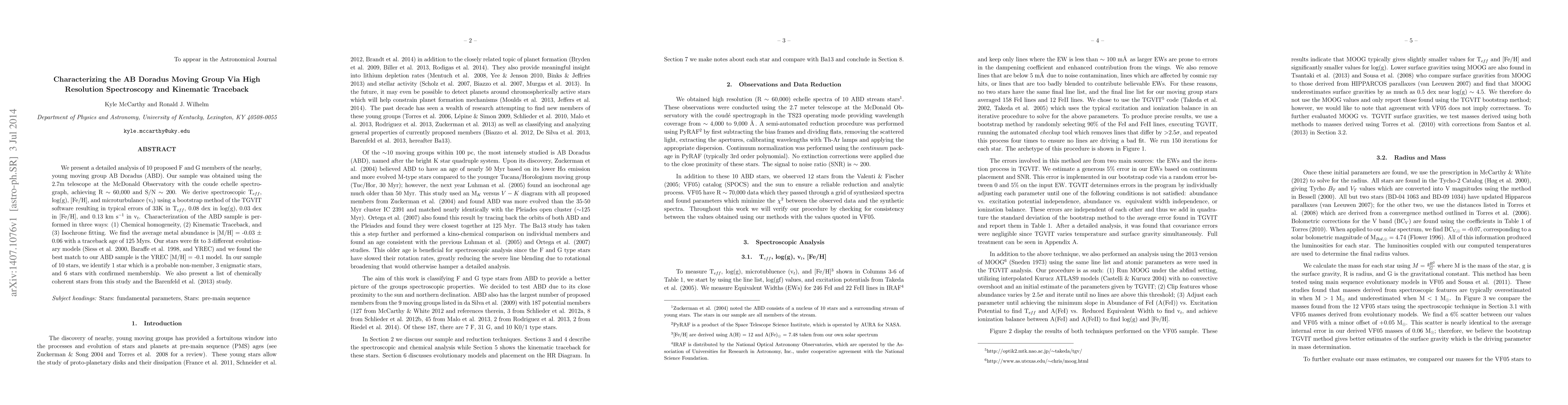 We present a detailed analysis of 10 proposed F and G members of the nearby, young moving group AB Doradus (ABD). Our sample was obtained using the 2.7m telescope at the McDonald Observatory with the coude echelle spectrograph, achieving R $\sim$ 60,000 and S/N $\sim$ 200. We derive spectroscopic T$_{eff}$, log(g), [Fe/H], and microturbulance (v$_{t}$) using a bootstrap method of the TGVIT software resulting in typical errors of 33K in T$_{eff}$, 0.08 dex in log(g), 0.03 dex in [Fe/H], and 0.13 km s$^{-1}$ in v$_{t}$. Characterization of the ABD sample is performed in three ways: (1) Chemical homogeneity, (2) Kinematic Traceback, and (3) Isochrone fitting. We find the average metal abundance is [M/H] = -0.03 $\pm$ 0.06 with a traceback age of 125 Myrs. Our stars were fit to 3 different evolutionary models (Siess et al. 2000, Baraffe et al. 1998, and YREC) and we found the best match to our ABD sample is the YREC [M/H] = -0.1 model. In our sample of 10 stars, we identify 1 star which is a probable non-member, 3 enigmatic stars, and 6 stars with confirmed membership. We also present a list of chemically coherent stars from this study and the Barenfeld et al. (2013) study.