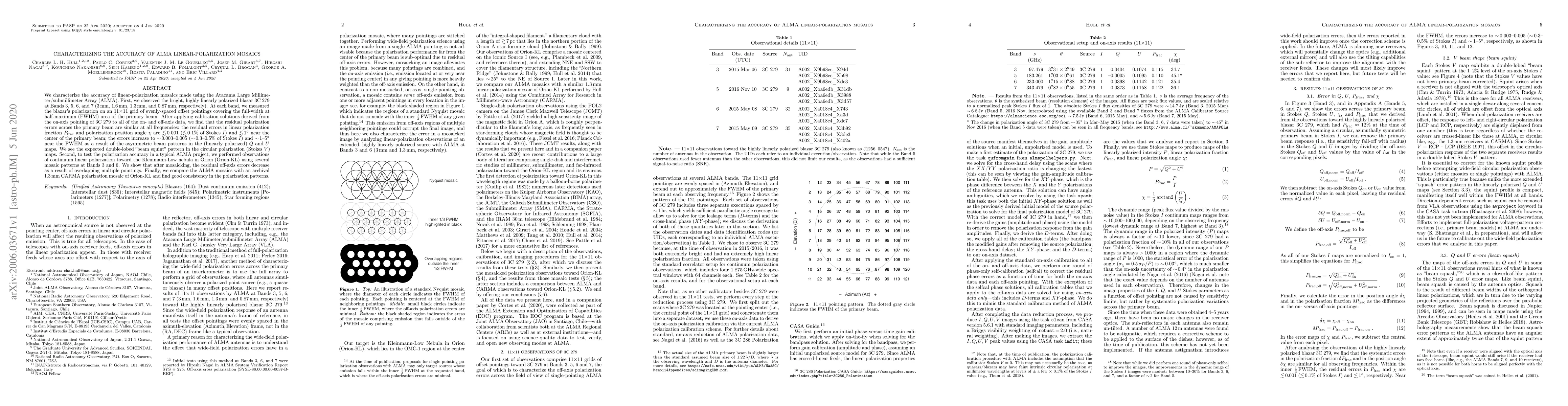 We characterize the accuracy of linear-polarization mosaics made using the Atacama Large Millimeter/submillimeter Array (ALMA). First, we observed the bright, highly linearly polarized blazar 3C 279 at Bands 3, 5, 6, and 7 (3 mm, 1.6 mm, 1.3 mm, and 0.87 mm, respectively). At each band, we measured the blazar's polarization on an 11$\times$11 grid of evenly-spaced offset pointings covering the full-width at half-maximum (FWHM) area of the primary beam. After applying calibration solutions derived from the on-axis pointing of 3C 279 to all of the on- and off-axis data, we find that the residual polarization errors across the primary beam are similar at all frequencies: the residual errors in linear polarization fraction $P_\textrm{frac}$ and polarization position angle $\chi$ are $\lesssim$0.001 ($\lesssim$0.1% of Stokes $I$) and $\lesssim$1$^\circ$ near the center of the primary beam; the errors increase to $\sim$0.003-0.005 ($\sim$0.3-0.5% of Stokes $I$) and $\sim$1-5$^\circ$ near the FWHM as a result of the asymmetric beam patterns in the (linearly polarized) $Q$ and $U$ maps. We see the expected double-lobed "beam squint" pattern in the circular polarization (Stokes $V$) maps. Second, to test the polarization accuracy in a typical ALMA project, we performed observations of continuum linear polarization toward the Kleinmann-Low nebula in Orion (Orion-KL) using several mosaic patterns at Bands 3 and 6. We show that after mosaicking, the residual off-axis errors decrease as a result of overlapping multiple pointings. Finally, we compare the ALMA mosaics with an archival 1.3 mm CARMA polarization mosaic of Orion-KL and find good consistency in the polarization patterns.