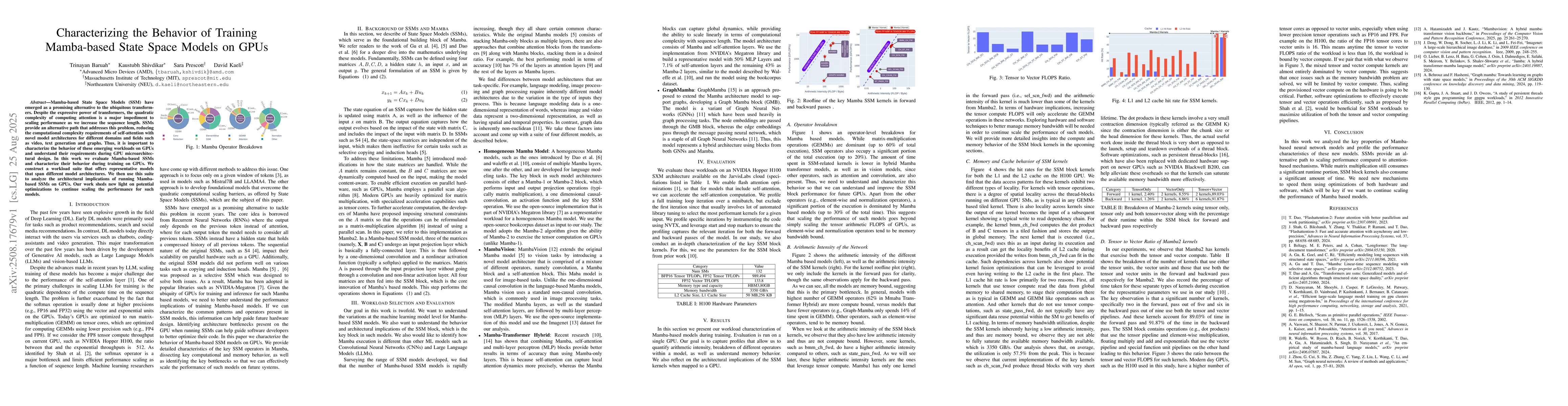 Mamba-based State Space Models (SSM) have emerged as a promising alternative to the ubiquitous transformers. Despite the expressive power of transformers, the quadratic complexity of computing attention is a major impediment to scaling performance as we increase the sequence length. SSMs provide an alternative path that addresses this problem, reducing the computational complexity requirements of self-attention with novel model architectures for different domains and fields such as video, text generation and graphs. Thus, it is important to characterize the behavior of these emerging workloads on GPUs and understand their requirements during GPU microarchitectural design. In this work we evaluate Mamba-based SSMs and characterize their behavior during training on GPUs. We construct a workload suite that offers representative models that span different model architectures. We then use this suite to analyze the architectural implications of running Mamba-based SSMs on GPUs. Our work sheds new light on potential optimizations to continue scaling the performance for such models.