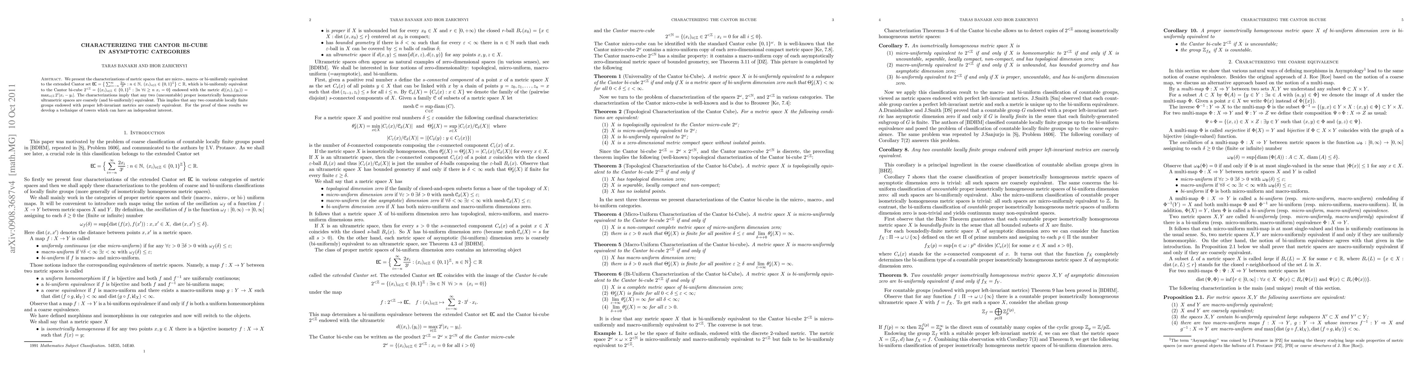 We present the characterization of metric spaces that are micro-, macro- or bi-uniformly equivalent to the extended Cantor set $\{\sum_{i=-n}^\infty\frac{2x_i}{3^i}:n\in\IN ,\;(x_i)_{i\in\IZ}\in\{0,1\}^\IZ\}\subset\IR$, which is bi-uniformly equivalent to the Cantor bi-cube $2^{<\IZ}=\{(x_i)_{i\in\IZ}\in \{0,1\}^\IZ:\exists n\;\forall i\ge n\;x_i=0\}$ endowed with the metric $d((x_i),(y_i))=\max_{i\in\IZ}2^i|x_i-y_i|$. Those characterizations imply that any two (uncountable) proper isometrically homogeneous ultrametric spaces are coarsely (and bi-uniformly) equivalent. This implies that any two countable locally finite groups endowed with proper left-invariant metrics are coarsely equivalent. For the proof of these results we develop a technique of towers which can have an independent interest.