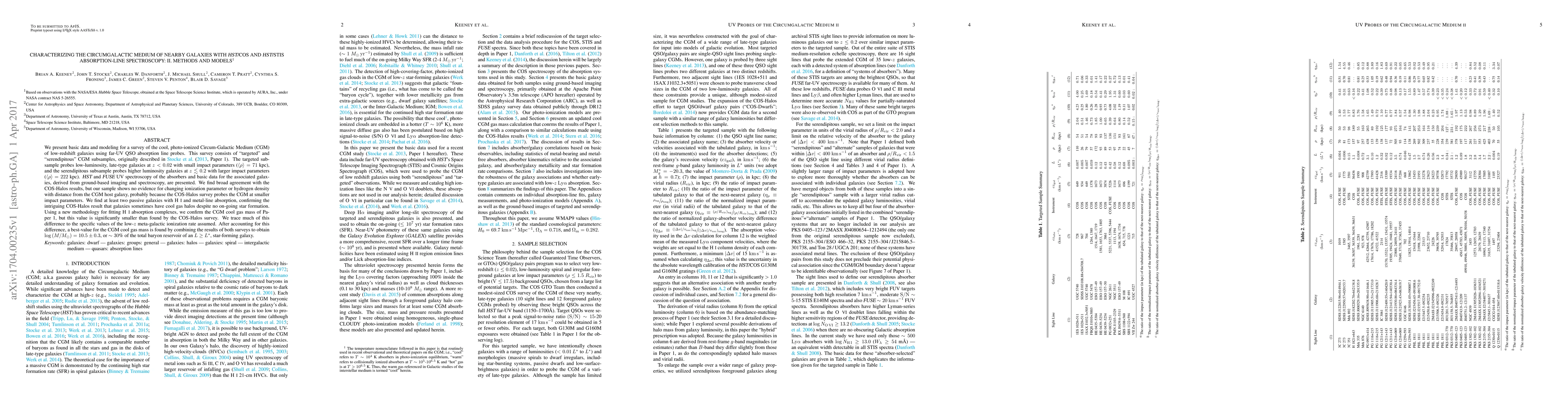 We present basic data and modeling for a survey of the cool, photo-ionized Circum-Galactic Medium (CGM) of low-redshift galaxies using far-UV QSO absorption line probes. This survey consists of "targeted" and "serendipitous" CGM subsamples, originally described in Stocke et al. (2013, Paper 1). The targeted subsample probes low-luminosity, late-type galaxies at $z<0.02$ with small impact parameters ($\langle\rho\rangle = 71$ kpc), and the serendipitous subsample probes higher luminosity galaxies at $z\lesssim0.2$ with larger impact parameters ($\langle\rho\rangle = 222$ kpc). HST and FUSE UV spectroscopy of the absorbers and basic data for the associated galaxies, derived from ground-based imaging and spectroscopy, are presented. We find broad agreement with the COS-Halos results, but our sample shows no evidence for changing ionization parameter or hydrogen density with distance from the CGM host galaxy, probably because the COS-Halos survey probes the CGM at smaller impact parameters. We find at least two passive galaxies with H I and metal-line absorption, confirming the intriguing COS-Halos result that galaxies sometimes have cool gas halos despite no on-going star formation. Using a new methodology for fitting H I absorption complexes, we confirm the CGM cool gas mass of Paper 1, but this value is significantly smaller than found by the COS-Halos survey. We trace much of this difference to the specific values of the low-$z$ meta-galactic ionization rate assumed. After accounting for this difference, a best-value for the CGM cool gas mass is found by combining the results of both surveys to obtain $\log{(M/M_{\odot})}=10.5\pm0.3$, or ~30% of the total baryon reservoir of an $L \geq L^*$, star-forming galaxy.