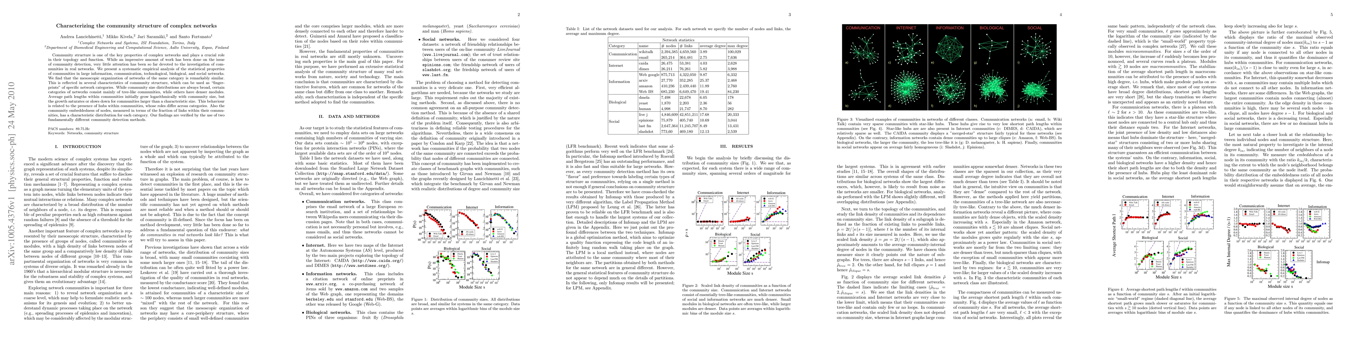 Community structure is one of the key properties of complex networks and plays a crucial role in their topology and function. While an impressive amount of work has been done on the issue of community detection, very little attention has been so far devoted to the investigation of communities in real networks. We present a systematic empirical analysis of the statistical properties of communities in large information, communication, technological, biological, and social networks. We find that the mesoscopic organization of networks of the same category is remarkably similar. This is reflected in several characteristics of community structure, which can be used as ``fingerprints'' of specific network categories. While community size distributions are always broad, certain categories of networks consist mainly of tree-like communities, while others have denser modules. Average path lengths within communities initially grow logarithmically with community size, but the growth saturates or slows down for communities larger than a characteristic size. This behaviour is related to the presence of hubs within communities, whose roles differ across categories. Also the community embeddedness of nodes, measured in terms of the fraction of links within their communities, has a characteristic distribution for each category. Our findings are verified by the use of two fundamentally different community detection methods.