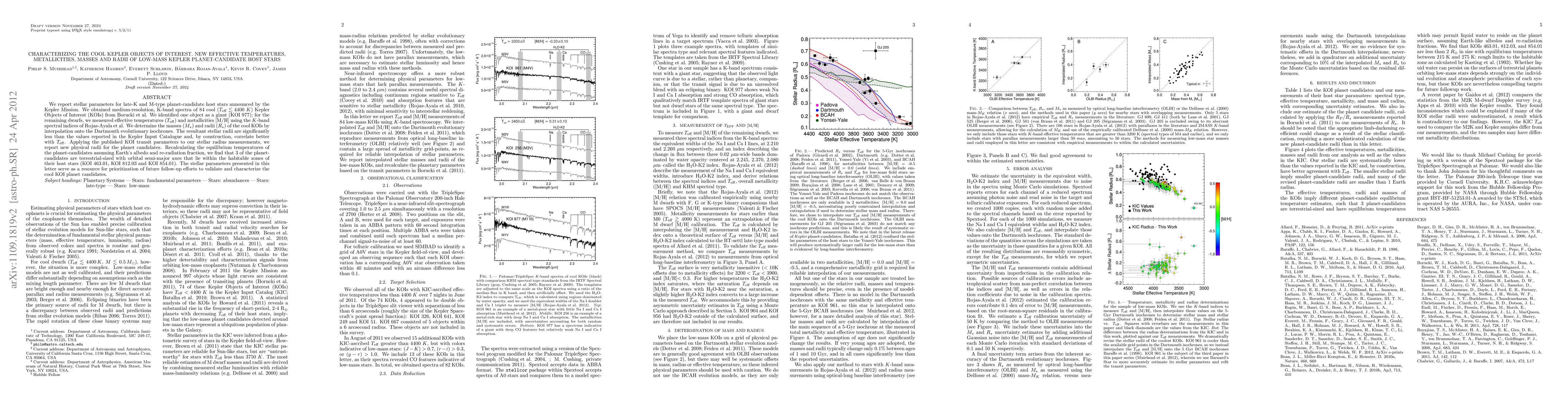 This paper characterizes the stellar parameters of late-K and M-type planet-candidate host stars from the Kepler Mission, determining new effective temperatures, metallicities, masses, and radii for 83 cool Kepler Objects of Interest. The study finds that the newly determined stellar radii are smaller than previously reported, leading to revised planet-candidate radii and identifying three terrestrial-sized candidates within the habitable zones of their host stars.
