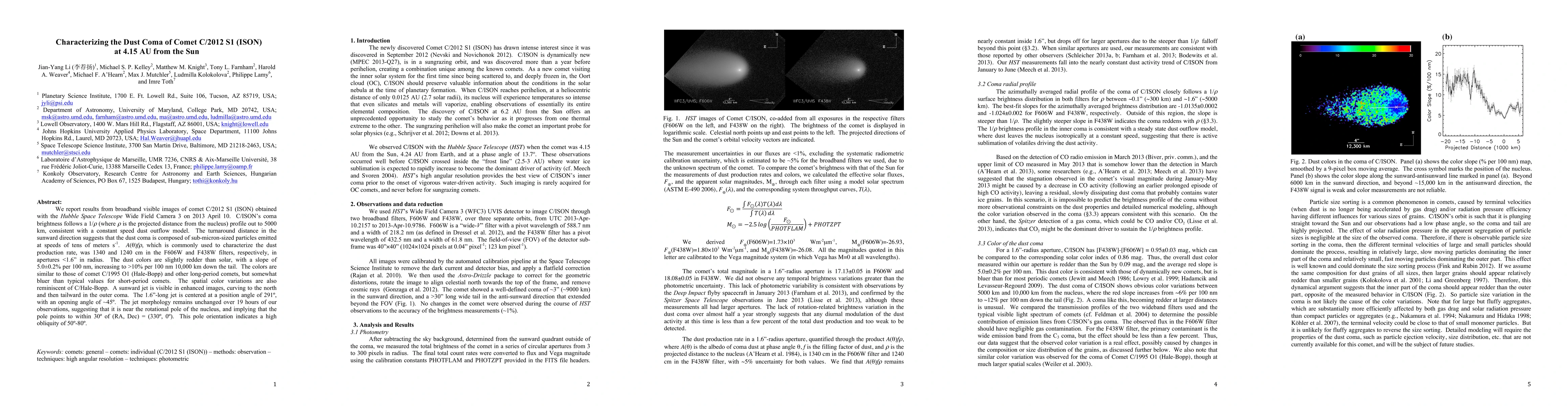 We report results from broadband visible images of comet C/2012 S1 (ISON) obtained with the Hubble Space Telescope Wide Field Camera 3 on 2013 April 10. C/ISON's coma brightness follows a 1/{\rho} (where {\rho} is the projected distance from the nucleus) profile out to 5000 km, consistent with a constant speed dust outflow model. The turnaround distance in the sunward direction suggests that the dust coma is composed of sub-micron-sized particles emitted at speeds of tens of meters s$^{-1}$. A({\theta})f{\rho}, which is commonly used to characterize the dust production rate, was 1340 and 1240 cm in the F606W and F438W filters, respectively, in apertures <1.6" in radius. The dust colors are slightly redder than solar, with a slope of 5.0$\pm$0.2% per 100 nm, increasing to >10% per 100 nm 10,000 km down the tail. The colors are similar to those of comet C/1995 O1 (Hale-Bopp) and other long-period comets, but somewhat bluer than typical values for short-period comets. The spatial color variations are also reminiscent of C/Hale-Bopp. A sunward jet is visible in enhanced images, curving to the north and then tailward in the outer coma. The 1.6"-long jet is centered at a position angle of 291$^\circ$, with an opening angle of about 45$^\circ$. The jet morphology remains unchanged over 19 hours of our observations, suggesting that it is near the rotational pole of the nucleus, and implying that the pole points to within 30 deg of (RA, Dec) = (330$^\circ$, 0$^\circ$). This pole orientation indicates a high obliquity of 50$^\circ$-80$^\circ$.
