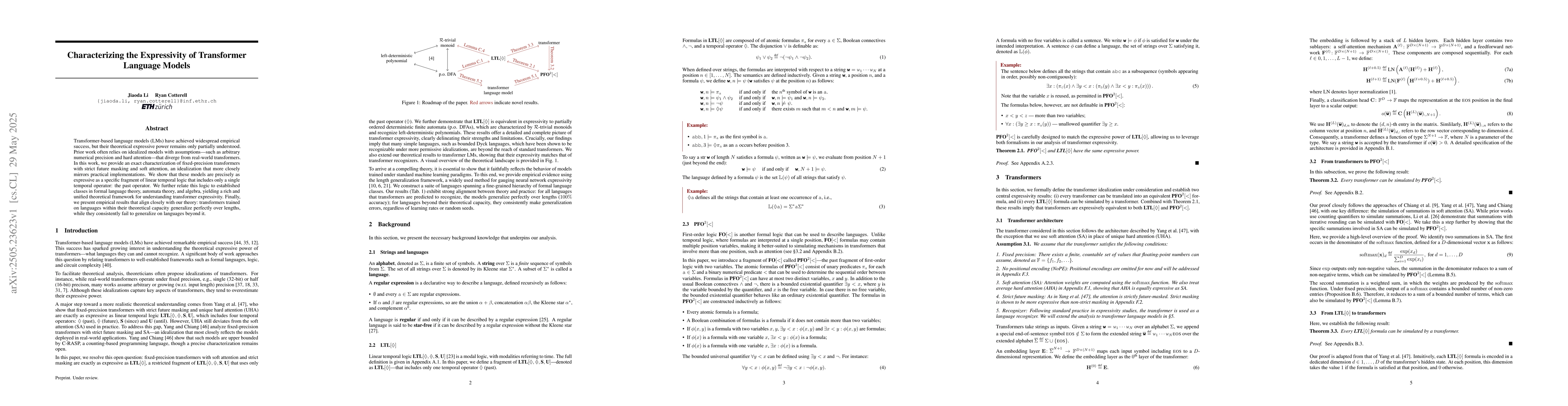 An exact characterization of transformer expressivity as a fragment of linear temporal logic with past operator, linking it to formal language theory and automata theory.