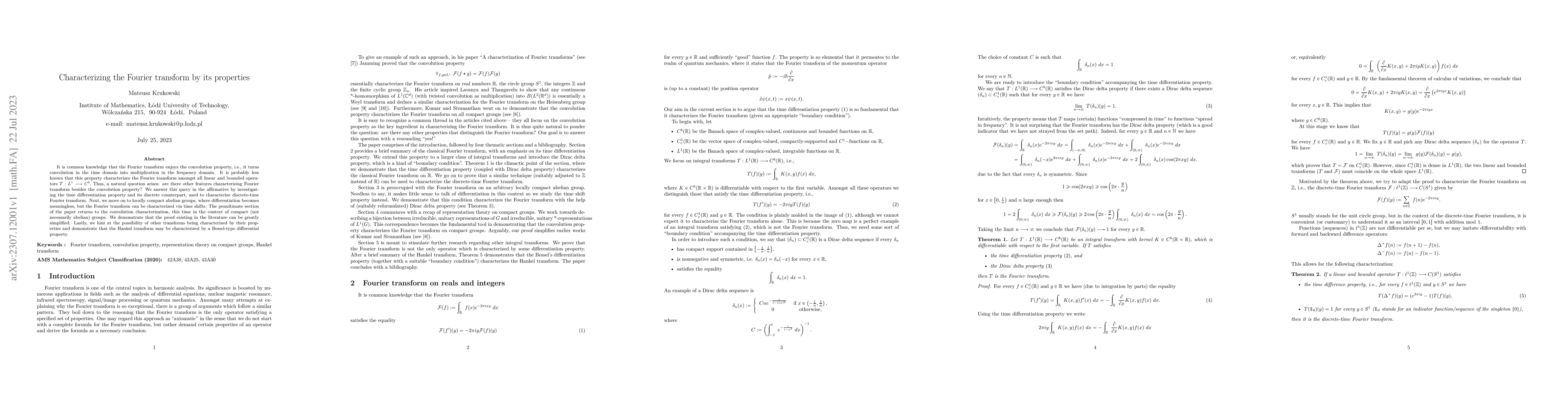 This paper explores various properties that uniquely characterize the Fourier transform, including the convolution property, time differentiation, and time shifts. It simplifies the existing proof for the convolution characterization in compact groups and suggests that other transforms, like the Hankel transform, can also be characterized by specific properties.