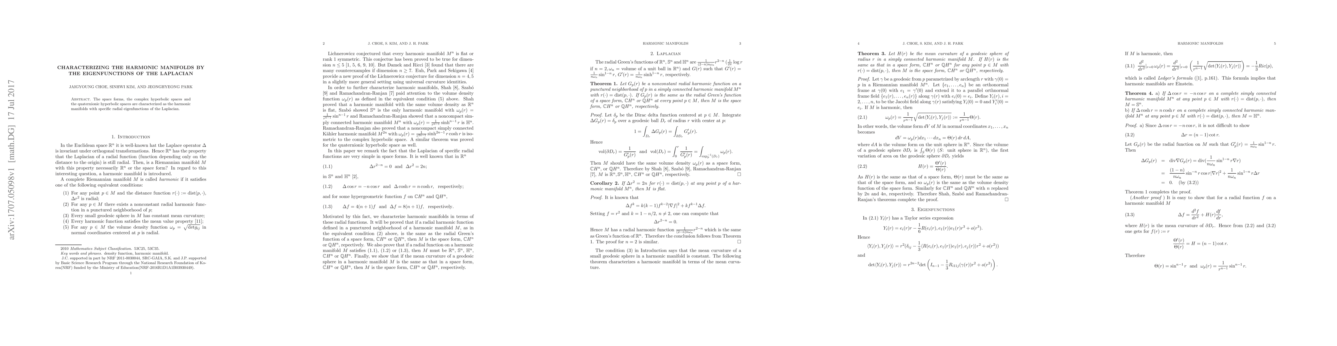 Summary: This paper characterizes harmonic manifolds, specifically space forms, complex hyperbolic spaces, and quaternionic hyperbolic spaces, through their unique radial eigenfunctions of the Laplacian. The study reveals how these manifolds are distinguished by their specific eigenfunction properties.