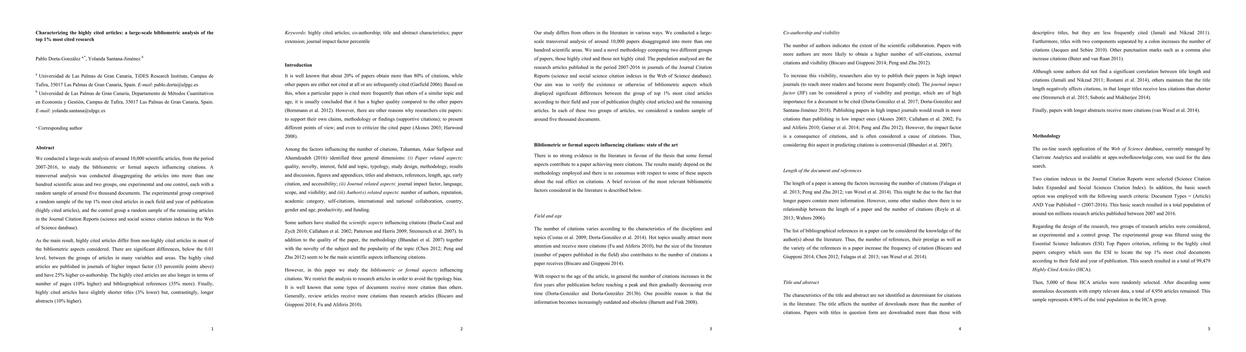 This study analyzes 10,000 scientific articles from 2007-2016 to identify bibliometric factors influencing citations. Highly cited articles differ significantly from others in various aspects, including higher impact factor journals, greater co-authorship, longer length, and more references, but slightly shorter titles and longer abstracts.