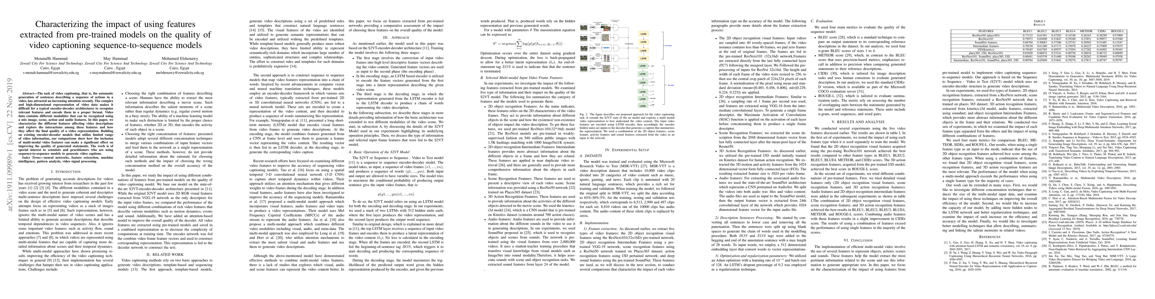 The task of video captioning, that is, the automatic generation of sentences describing a sequence of actions in a video, has attracted an increasing attention recently. The complex and high-dimensional representation of video data makes it difficult for a typical encoder-decoder architectures to recognize relevant features and encode them in a proper format. Video data contains different modalities that can be recognized using a mix image, scene, action and audio features. In this paper, we characterize the different features affecting video descriptions and explore the interactions among these features and how they affect the final quality of a video representation. Building on existing encoder-decoder models that utilize limited range of video information, our comparisons show how the inclusion of multi-modal video features can make a significant effect on improving the quality of generated statements. The work is of special interest to scientists and practitioners who are using sequence-to-sequence models to generate video captions.