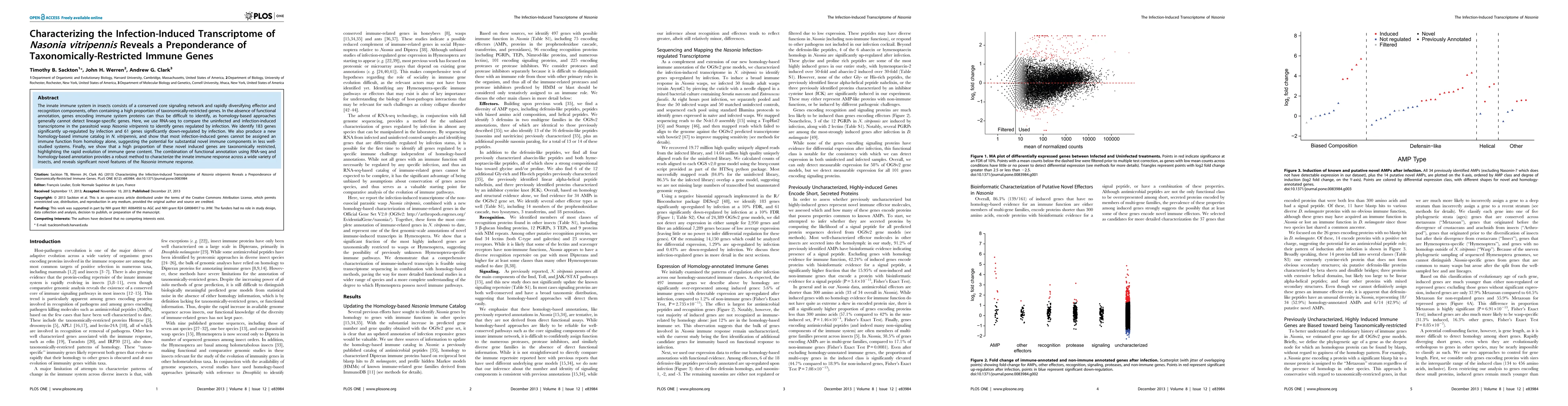 The innate immune system in insects consists of a conserved core signaling network and rapidly diversifying effector and recognition components, often containing a high proportion of taxonomically-restricted genes. In the absence of functional annotation, genes encoding immune system proteins can thus be difficult to identify, as homology-based approaches generally cannot detect lineage-specific genes. Here, we use RNA-seq to compare the uninfected and infection-induced transcriptome in the parasitoid wasp Nasonia vitripennis to identify genes regulated by infection. We identify 183 genes significantly up-regulated by infection and 61 genes significantly down-regulated by infection. We also produce a new homology-based immune catalog in N. vitripennis, and show that most infection-induced genes are not assigned an immune function from homology alone, suggesting the potential for substantial novel immune components in less-well-studied systems. Finally, we show that a high proportion of these novel induced genes are taxonomically-restricted, highlighting the rapid evolution of immune gene content. The combination of functional annotation using RNA-seq and homology-based annotation provides a robust method to characterize the innate immune response across a wide variety of insects, and reveals significant novel features of the Nasonia immune response.
