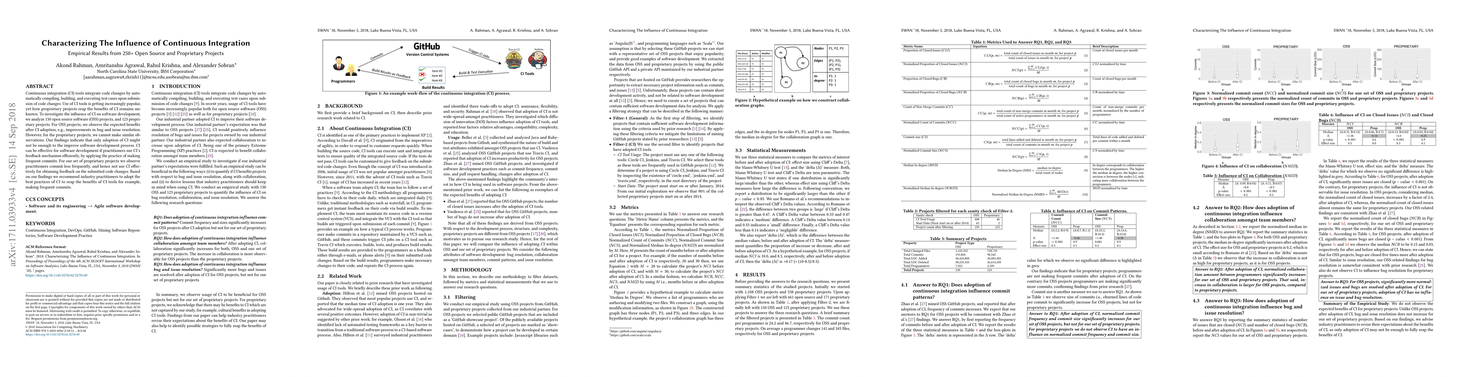 This study investigates the influence of continuous integration (CI) across 250+ open source and proprietary projects, finding that while OSS projects benefit from CI in bug resolution, proprietary projects do not. The study recommends that practitioners adopt best CI practices, emphasizing frequent commits to leverage CI's feedback mechanism effectively.