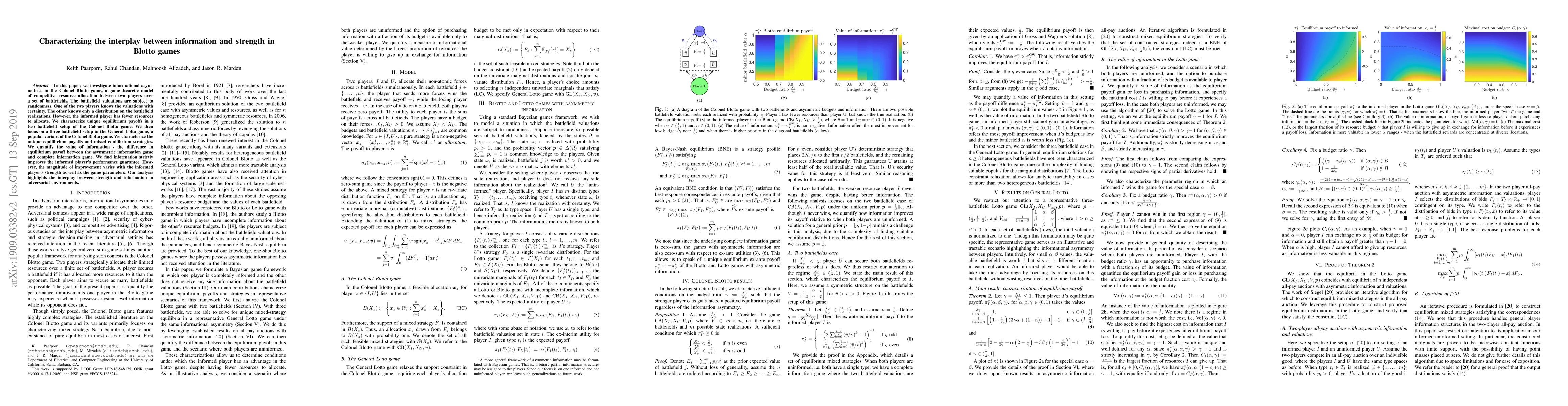 In this paper, we investigate informational asymmetries in the Colonel Blotto game, a game-theoretic model of competitive resource allocation between two players over a set of battlefields. The battlefield valuations are subject to randomness. One of the two players knows the valuations with certainty. The other knows only a distribution on the battlefield realizations. However, the informed player has fewer resources to allocate. We characterize unique equilibrium payoffs in a two battlefield setup of the Colonel Blotto game. We then focus on a three battlefield setup in the General Lotto game, a popular variant of the Colonel Blotto game. We characterize the unique equilibrium payoffs and mixed equilibrium strategies. We quantify the value of information - the difference in equilibrium payoff between the asymmetric information game and complete information game. We find information strictly improves the informed player's performance guarantee. However, the magnitude of improvement varies with the informed player's strength as well as the game parameters. Our analysis highlights the interplay between strength and information in adversarial environments.
