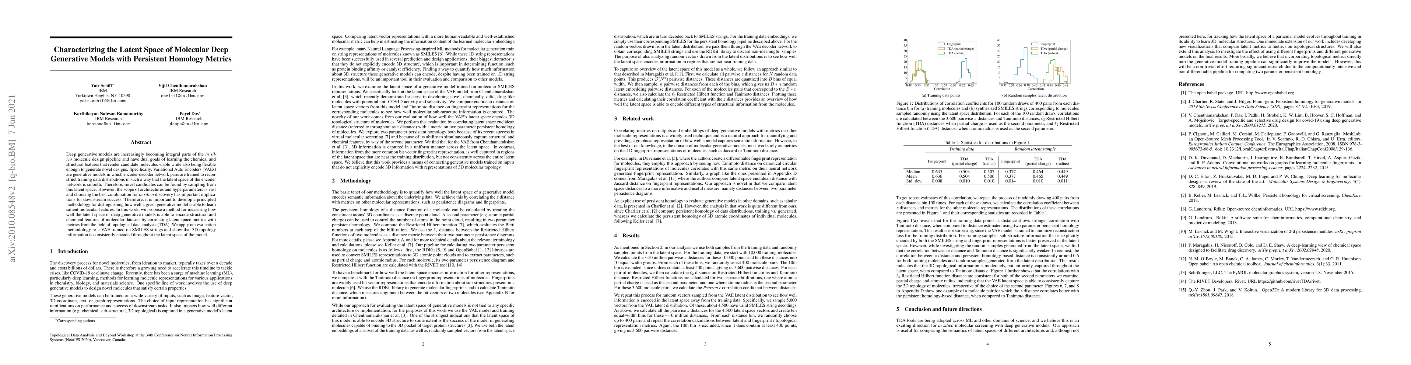 This paper proposes a method using persistent homology metrics from topological data analysis to characterize the latent space of Variational Autoencoders (VAEs) for molecular design. The study demonstrates that 3D topological information is encoded in the latent space, providing a principled way to evaluate the effectiveness of generative models in capturing molecular features.