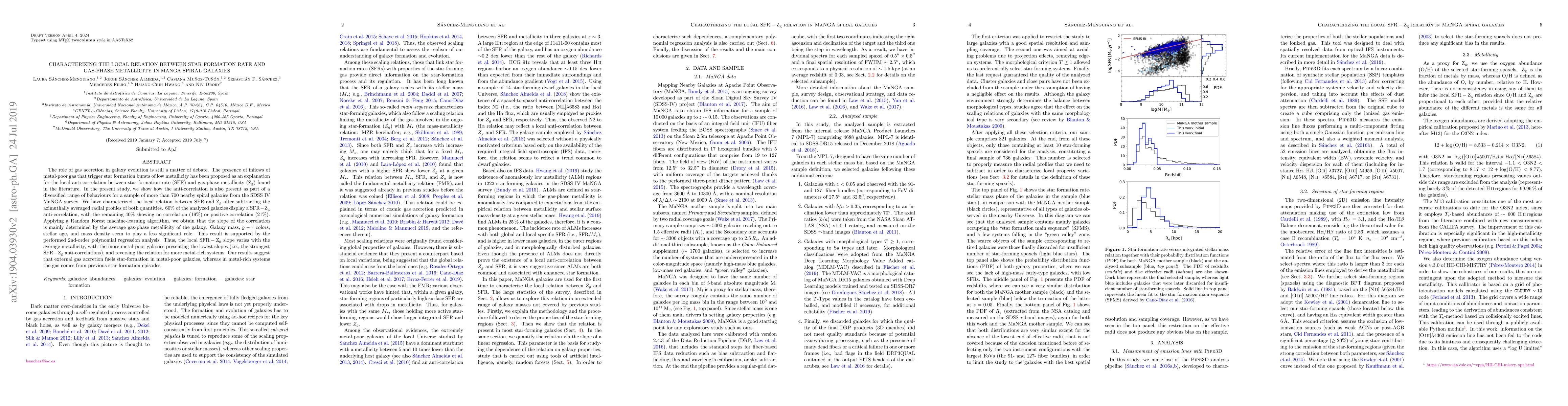 This study characterizes the local relation between star formation rate (SFR) and gas-phase metallicity ($\rm Z_g$) in over 700 nearby spiral galaxies from the MaNGA survey, finding that 60% exhibit an anti-correlation. The slope of this correlation is mainly determined by the galaxy's average gas-phase metallicity, with the strongest anti-correlations in metal-poor galaxies, suggesting external gas accretion drives star formation in these systems.