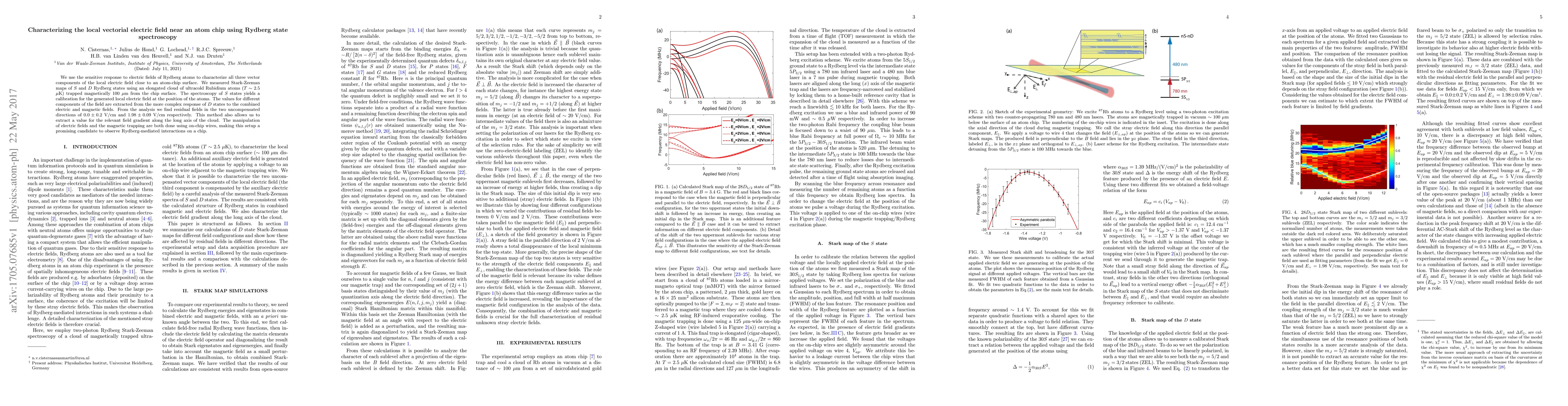 The study characterizes the local vectorial electric field near an atom chip using Rydberg state spectroscopy. An elongated cloud of ultracold Rubidium atoms is trapped magnetically 100 μm from the chip surface. Stark-Zeeman maps of S and D Rydberg states are measured to extract electric field components.