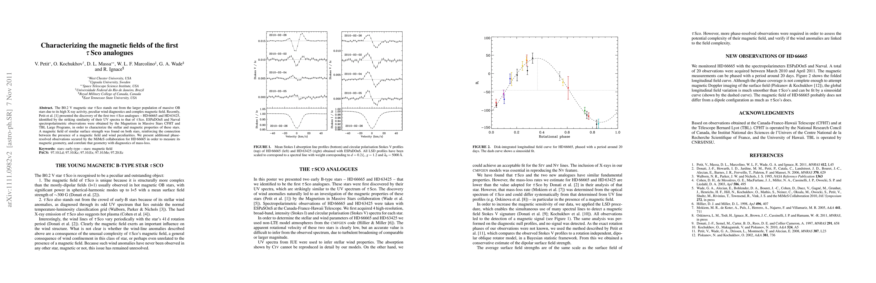 The B0.2 V magnetic star tau Sco stands out from the larger population of massive OB stars due to its high X-ray activity, peculiar wind diagnostics and complex magnetic field. Recently, Petit et al. 2011 presented the discovery of the first two tau Sco analogues -- HD 66665 and HD 63425, identified by the striking similarity of their UV spectra to that of tau Sco. ESPaDOnS and Narval spectropolarimetric observations were obtained by the Magnetism in Massive Stars CFHT and TBL Large Programs, in order to characterize the stellar and magnetic properties of these stars. A magnetic field of similar surface strength was found on both stars, reinforcing the connection between the presence of a magnetic field and wind peculiarities. We present additional phase-resolved observations secured by the MiMeS collaboration for HD 66665 in order to measure its magnetic geometry, and correlate that geometry with diagnostics of mass-loss.