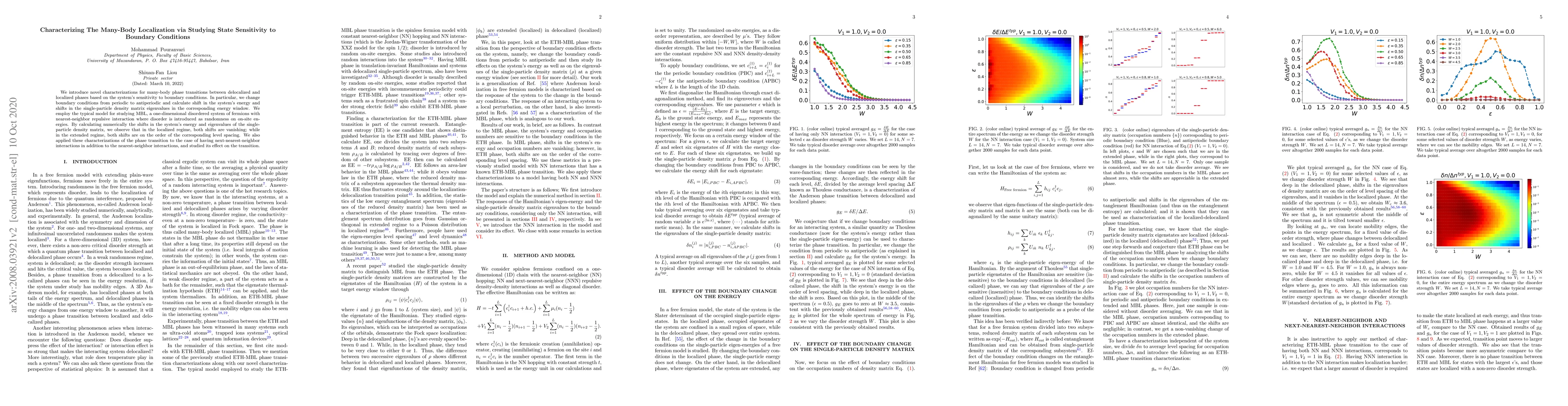We introduce novel characterizations for many-body phase transitions between delocalized and localized phases based on the system's sensitivity to boundary conditions. In particular, we change boundary conditions from periodic to antiperiodic and calculate shift in the system's energy and shifts in the single-particle density matrix eigenvalues in the corresponding energy window. We employ the typical model for studying MBL, a one-dimensional disordered system of fermions with nearest-neighbor repulsive interaction where disorder is introduced as randomness on on-site energies. By calculating numerically the shifts in the system's energy and eigenvalues of the single-particle density matrix, we observe that in the localized regime, both shifts are vanishing; while in the extended regime, both shifts are on the order of the corresponding level spacing. We also applied these characterizations of the phase transition to the case of having next-nearest-neighbor interactions in addition to the nearest-neighbor interactions, and studied its effect on the transition.