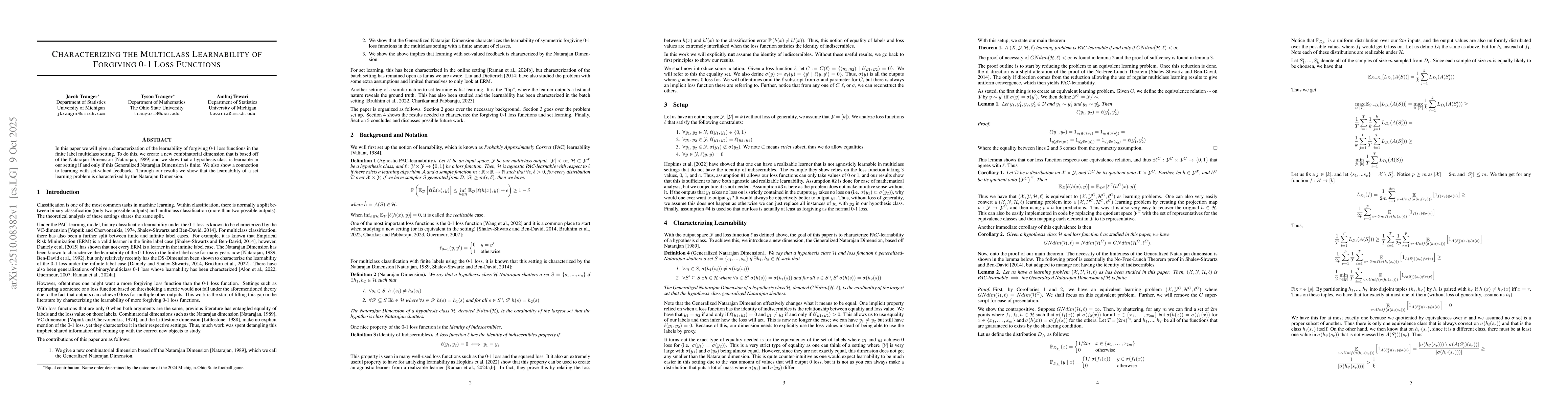 The paper introduces a new combinatorial dimension called the Generalized Natarajan Dimension to characterize the learnability of forgiving 0-1 loss functions in the multiclass setting. It uses PAC-learnability as the framework and establishes equivalence between the original problem and a quotient space problem.