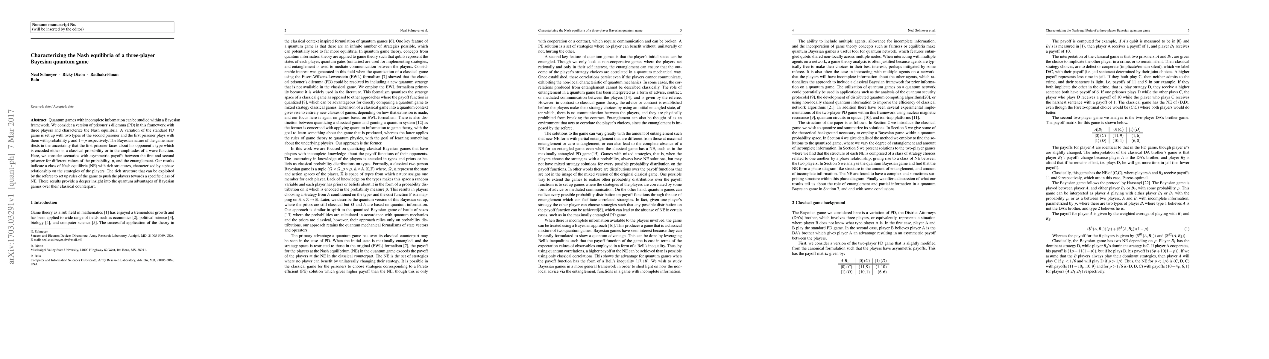This paper characterizes Nash equilibria in a three-player Bayesian quantum game modeled as a variation of the prisoner's dilemma, exploring asymmetric payoffs and entanglement. It reveals complex equilibria structures influenced by quantum uncertainty and wave function amplitudes, offering insights into quantum advantages over classical games.
