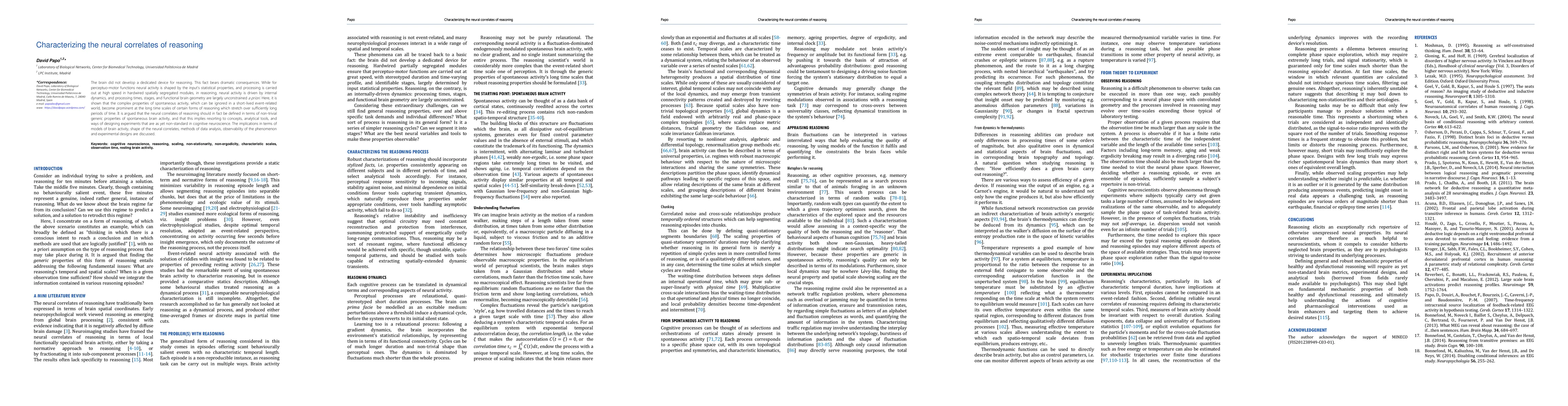 The brain did not develop a dedicated device for reasoning. This fact bears dramatic consequences. While for perceptuo-motor functions neural activity is shaped by the input's statistical properties, and processing is carried out at high speed in hardwired spatially segregated modules, in reasoning, neural activity is driven by internal dynamics, and processing times, stages, and functional brain geometry are largely unconstrained a priori. Here, it is shown that the complex properties of spontaneous activity, which can be ignored in a short-lived event-related world, become prominent at the long time scales of certain forms of reasoning which stretch over sufficiently long periods of time. It is argued that the neural correlates of reasoning should in fact be defined in terms of non-trivial generic properties of spontaneous brain activity, and that this implies resorting to concepts, analytical tools, and ways of designing experiments that are as yet non-standard in cognitive neuroscience. The implications in terms of models of brain activity, shape of the neural correlates, methods of data analysis, observability of the phenomenon and experimental designs are discussed.