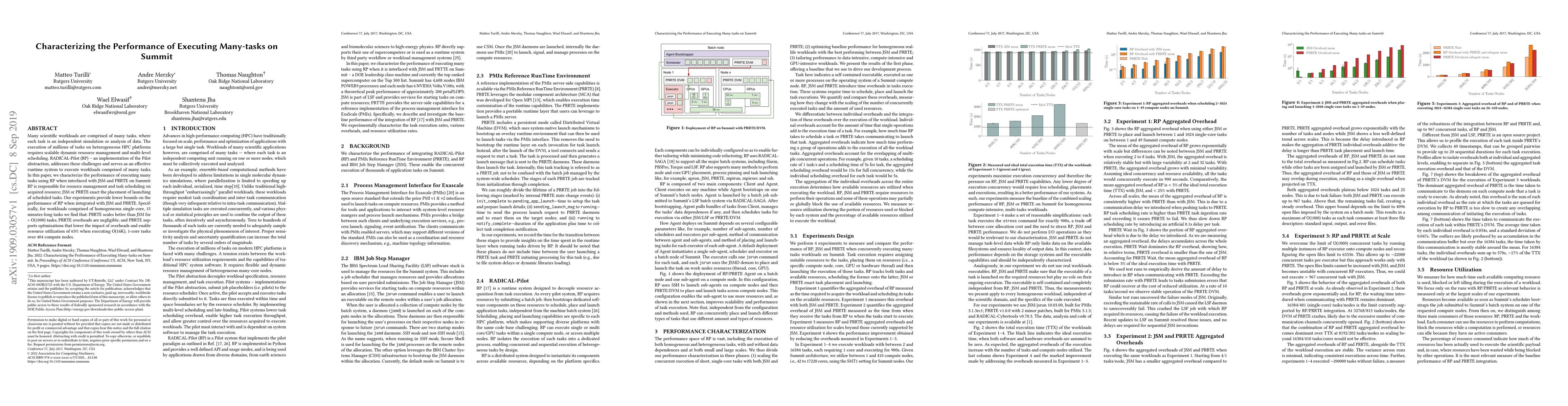 This paper characterizes the performance of executing many independent tasks on the Summit HPC platform using RADICAL-Pilot, finding that PRRTE scales better than JSM for over 1000 tasks and achieves 63% resource utilization for 16K single-core tasks across 404 nodes. PRRTE's overheads are negligible and it supports optimizations that enhance performance.