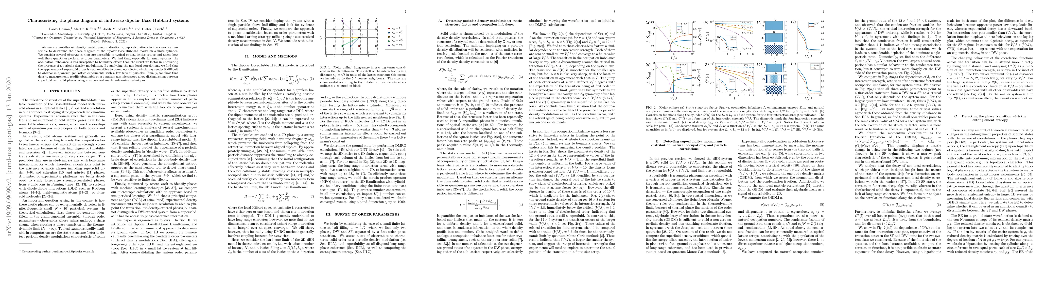 We use state-of-the-art density matrix renormalization group calculations in the canonical ensemble to determine the phase diagram of the dipolar Bose-Hubbard model on a finite cylinder. We consider several observables that are accessible in typical optical lattice setups and assess how well these quantities perform as order parameters. We find that, especially for small systems, the occupation imbalance is less susceptible to boundary effects than the structure factor in uncovering the presence of a periodic density modulation. By analysing the non-local correlations, we find that the appearance of supersolid order is very sensitive to boundary effects, which may render it difficult to observe in quantum gas lattice experiments with a few tens of particles. Finally, we show how density measurements readily obtainable on a quantum gas microscope allow distinguishing between superfluid and solid phases using unsupervised machine-learning techniques.