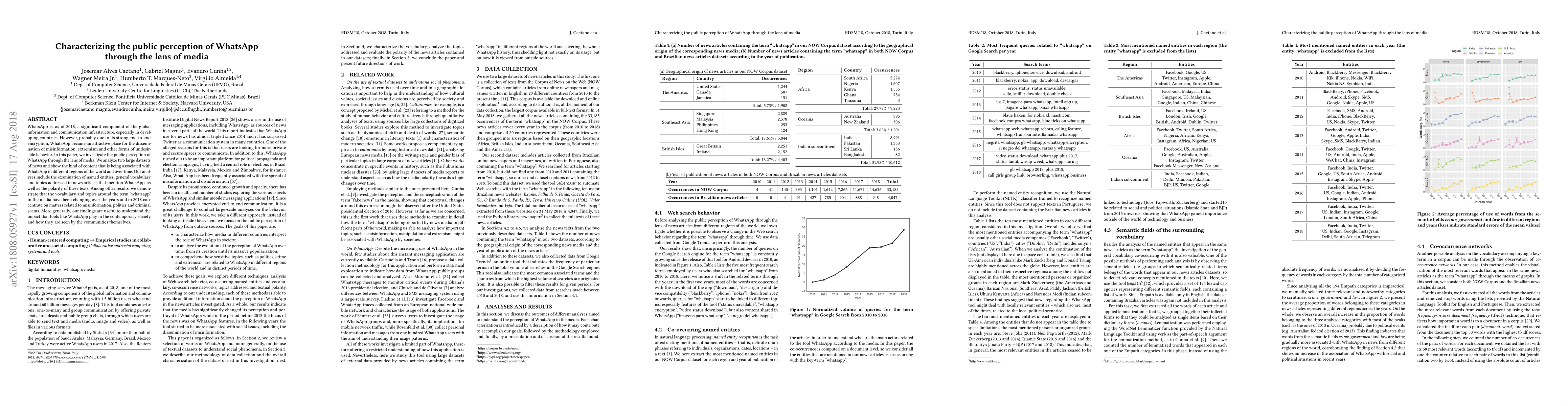 WhatsApp is, as of 2018, a significant component of the global information and communication infrastructure, especially in developing countries. However, probably due to its strong end-to-end encryption, WhatsApp became an attractive place for the dissemination of misinformation, extremism and other forms of undesirable behavior. In this paper, we investigate the public perception of WhatsApp through the lens of media. We analyze two large datasets of news and show the kind of content that is being associated with WhatsApp in different regions of the world and over time. Our analyses include the examination of named entities, general vocabulary, and topics addressed in news articles that mention WhatsApp, as well as the polarity of these texts. Among other results, we demonstrate that the vocabulary and topics around the term "whatsapp" in the media have been changing over the years and in 2018 concentrate on matters related to misinformation, politics and criminal scams. More generally, our findings are useful to understand the impact that tools like WhatsApp play in the contemporary society and how they are seen by the communities themselves.