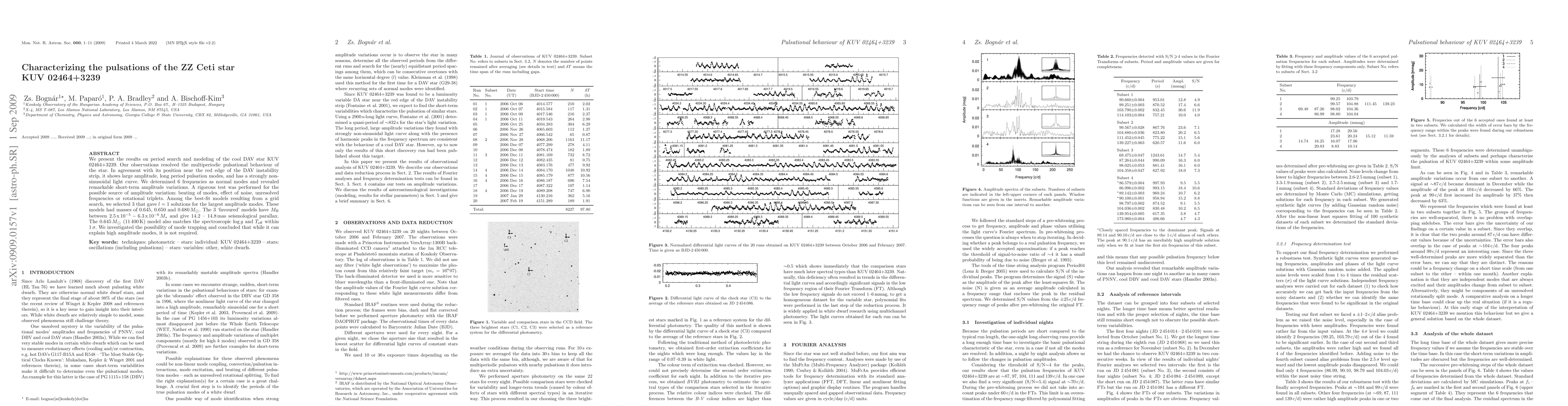 We present the results on period search and modeling of the cool DAV star KUV 02464+3239. Our observations resolved the multiperiodic pulsational behaviour of the star. In agreement with its position near the red edge of the DAV instability strip, it shows large amplitude, long period pulsation modes, and has a strongly non-sinusoidal light curve. We determined 6 frequencies as normal modes and revealed remarkable short-term amplitude variations. A rigorous test was performed for the possible source of amplitude variation: beating of modes, effect of noise, unresolved frequencies or rotational triplets. Among the best-fit models resulting from a grid search, we selected 3 that gave l=1 solutions for the largest amplitude modes. These models had masses of 0.645, 0.650 and 0.680 M_Sun. The 3 `favoured' models have M_H between 2.5x10^-5 - 6.3x10^-6 M_* and give 14.2 - 14.8 mas seismological parallax. The 0.645 M_Sun (11400 K) model also matches the spectroscopic log g and T_eff within 1 sigma. We investigated the possibility of mode trapping and concluded that while it can explain high amplitude modes, it is not required.