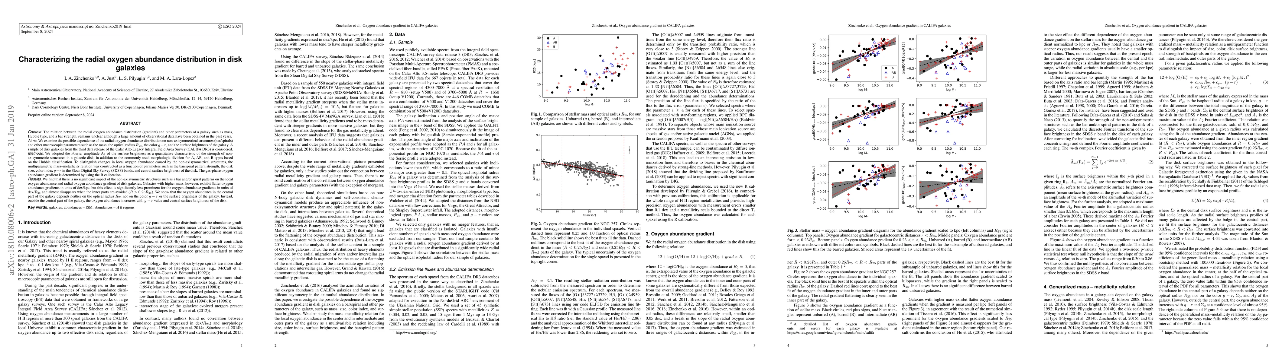 This study investigates the radial oxygen abundance in disk galaxies, finding no significant influence of non-axisymmetric structures like bars and spirals on local or radial oxygen abundance gradients. Higher mass galaxies show flatter oxygen abundance gradients, but this effect diminishes when considering the inner parts of the galaxy.