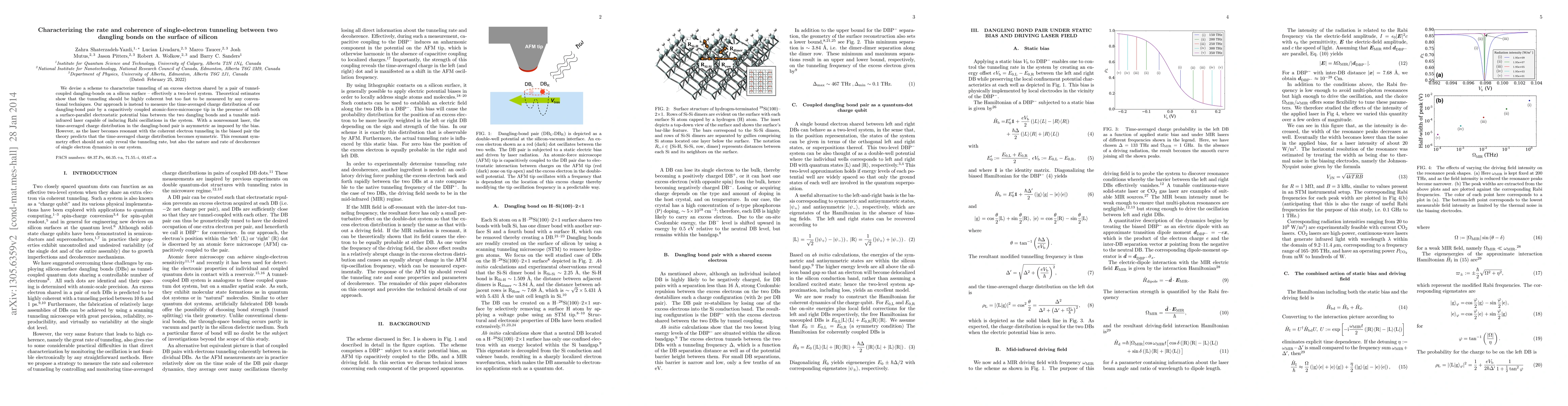 This research characterizes the highly coherent yet fast tunneling of a single electron between two dangling bonds on silicon using a capacitively coupled atomic-force microscope tip. The study reveals that the tunneling rate and decoherence dynamics can be inferred from the symmetry of the time-averaged charge distribution, induced by a tunable midinfrared laser.