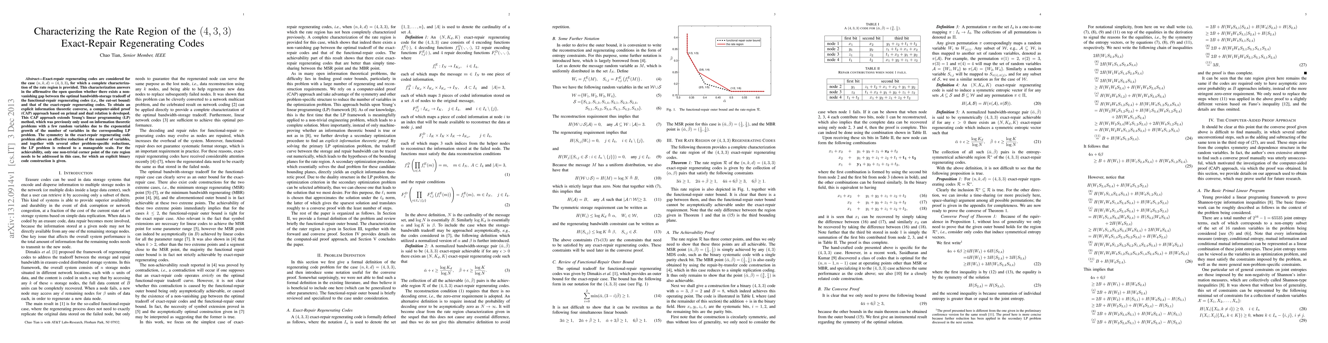 This paper characterizes the rate region for (4,3,3) exact-repair regenerating codes, confirming the existence of a non-vanishing gap between the optimal bandwidth-storage tradeoff of functional-repair and exact-repair codes. A computer-aided proof approach based on primal and dual relation extends Yeung's linear programming method to handle this problem, reducing the complexity through symmetry and specific reductions.