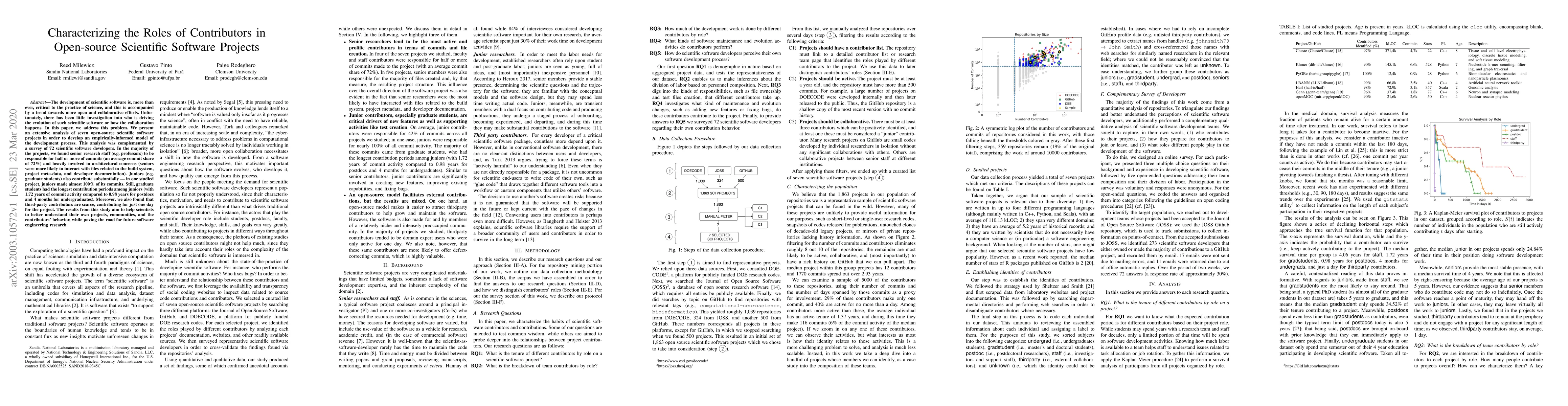 This paper analyzes seven open-source scientific software projects, identifying senior research staff as major contributors responsible for over half of the commits and key architectural decisions. Junior contributors, including graduate students, also play significant roles, though third-party contributors are rare.