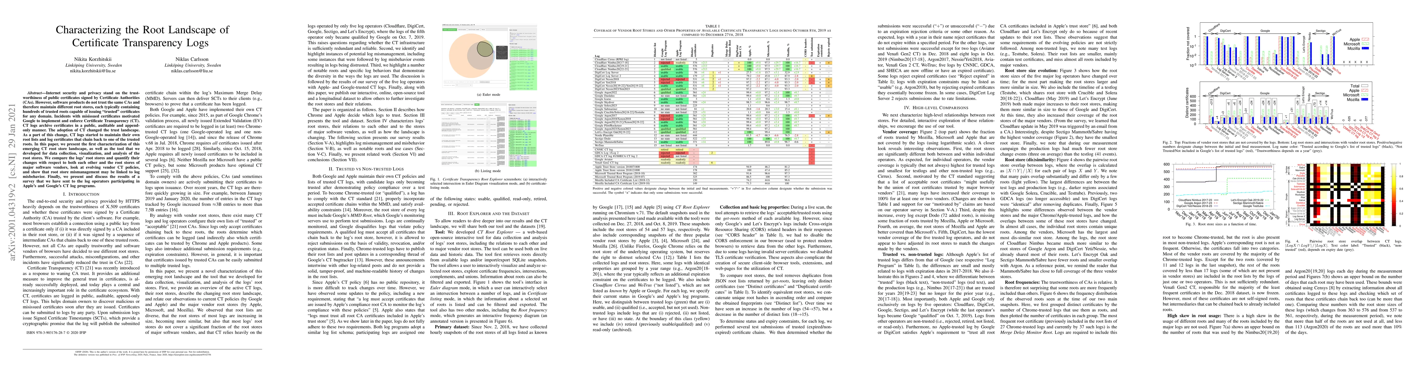 This paper characterizes the root landscape of Certificate Transparency logs, finding that log operators maintain their own unique root stores, which can evolve over time, and may mismanage roots linked to log misbehavior.