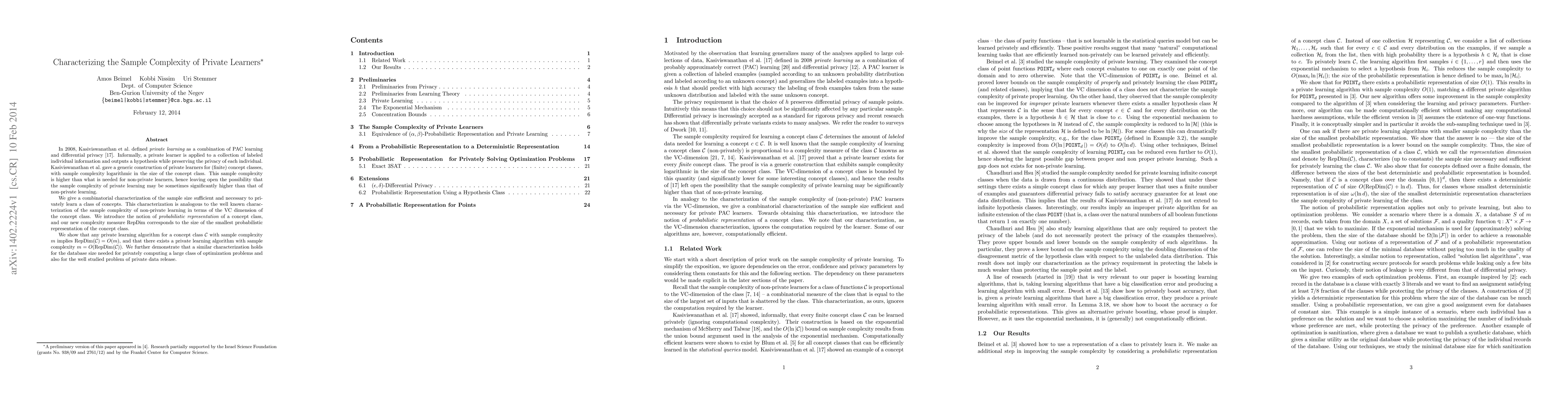 In 2008, Kasiviswanathan et al. defined private learning as a combination of PAC learning and differential privacy. Informally, a private learner is applied to a collection of labeled individual information and outputs a hypothesis while preserving the privacy of each individual. Kasiviswanathan et al. gave a generic construction of private learners for (finite) concept classes, with sample complexity logarithmic in the size of the concept class. This sample complexity is higher than what is needed for non-private learners, hence leaving open the possibility that the sample complexity of private learning may be sometimes significantly higher than that of non-private learning. We give a combinatorial characterization of the sample size sufficient and necessary to privately learn a class of concepts. This characterization is analogous to the well known characterization of the sample complexity of non-private learning in terms of the VC dimension of the concept class. We introduce the notion of probabilistic representation of a concept class, and our new complexity measure RepDim corresponds to the size of the smallest probabilistic representation of the concept class. We show that any private learning algorithm for a concept class C with sample complexity m implies RepDim(C)=O(m), and that there exists a private learning algorithm with sample complexity m=O(RepDim(C)). We further demonstrate that a similar characterization holds for the database size needed for privately computing a large class of optimization problems and also for the well studied problem of private data release.