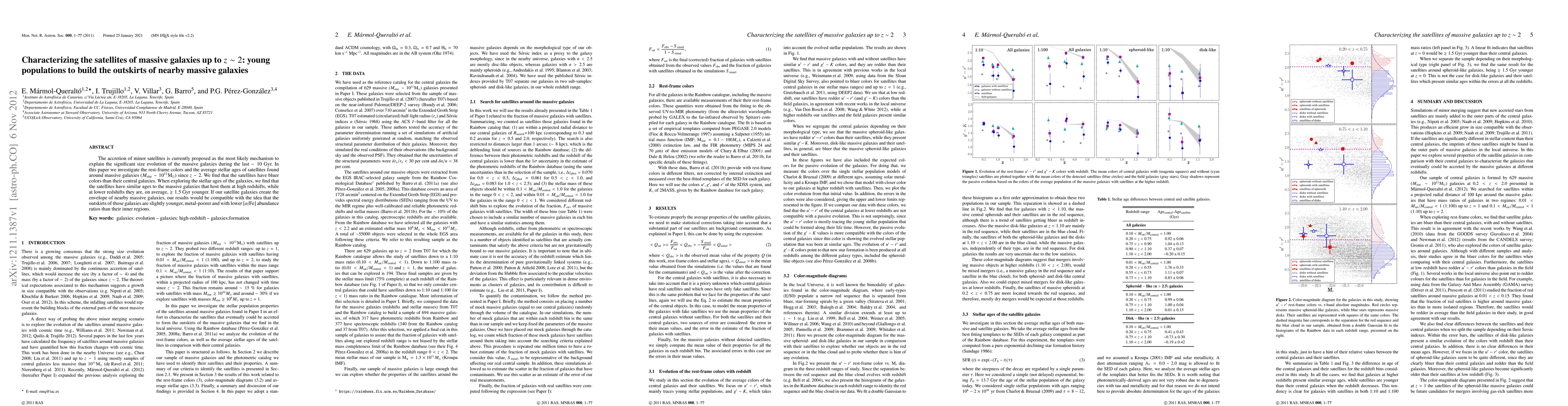 The accretion of minor satellites is currently proposed as the most likely mechanism to explain the significant size evolution of the massive galaxies during the last ~10 Gyr. In this paper we investigate the rest-frame colors and the average stellar ages of satellites found around massive galaxies (Mstar 10^11Msun) since z~2. We find that the satellites have bluer colors than their central galaxies. When exploring the stellar ages of the galaxies, we find that the satellites have similar ages to the massive galaxies that host them at high redshifts, while at lower redshifts they are, on average, ~1.5 Gyr younger. If our satellite galaxies create the envelope of nearby massive galaxies, our results would be compatible with the idea that the outskirts of those galaxies are slightly younger, metal-poorer and with lower [alpha/Fe] abundance ratios than their inner regions.