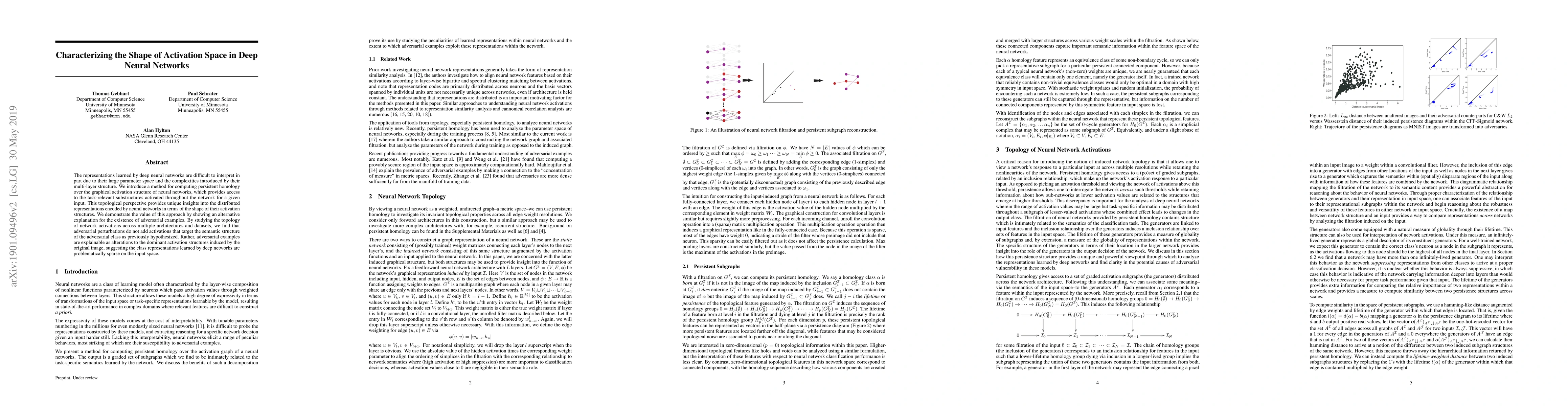 The representations learned by deep neural networks are difficult to interpret in part due to their large parameter space and the complexities introduced by their multi-layer structure. We introduce a method for computing persistent homology over the graphical activation structure of neural networks, which provides access to the task-relevant substructures activated throughout the network for a given input. This topological perspective provides unique insights into the distributed representations encoded by neural networks in terms of the shape of their activation structures. We demonstrate the value of this approach by showing an alternative explanation for the existence of adversarial examples. By studying the topology of network activations across multiple architectures and datasets, we find that adversarial perturbations do not add activations that target the semantic structure of the adversarial class as previously hypothesized. Rather, adversarial examples are explainable as alterations to the dominant activation structures induced by the original image, suggesting the class representations learned by deep networks are problematically sparse on the input space.