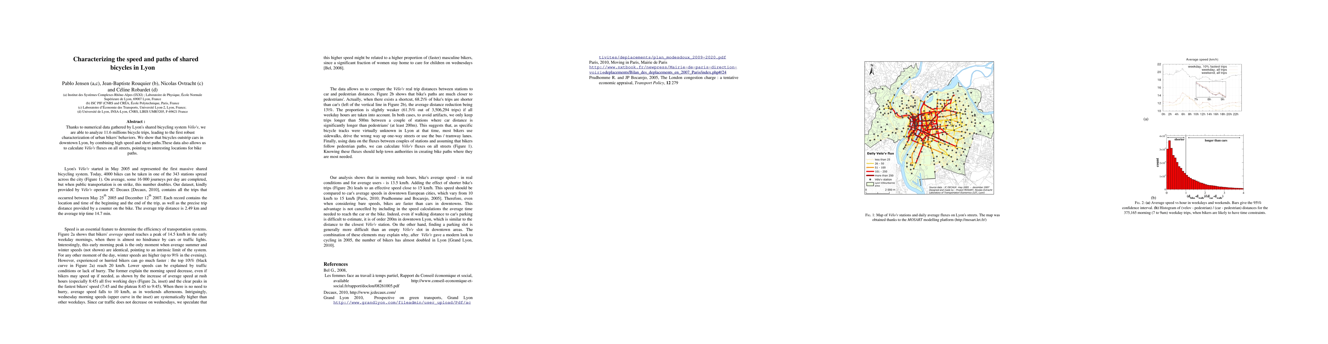 Thanks to numerical data gathered by Lyon's shared bicycling system V\'elo'v, we are able to analyze 11.6 millions bicycle trips, leading to the first robust characterization of urban bikers' behaviors. We show that bicycles outstrip cars in downtown Lyon, by combining high speed and short paths.These data also allows us to calculate V\'elo'v fluxes on all streets, pointing to interesting locations for bike paths.