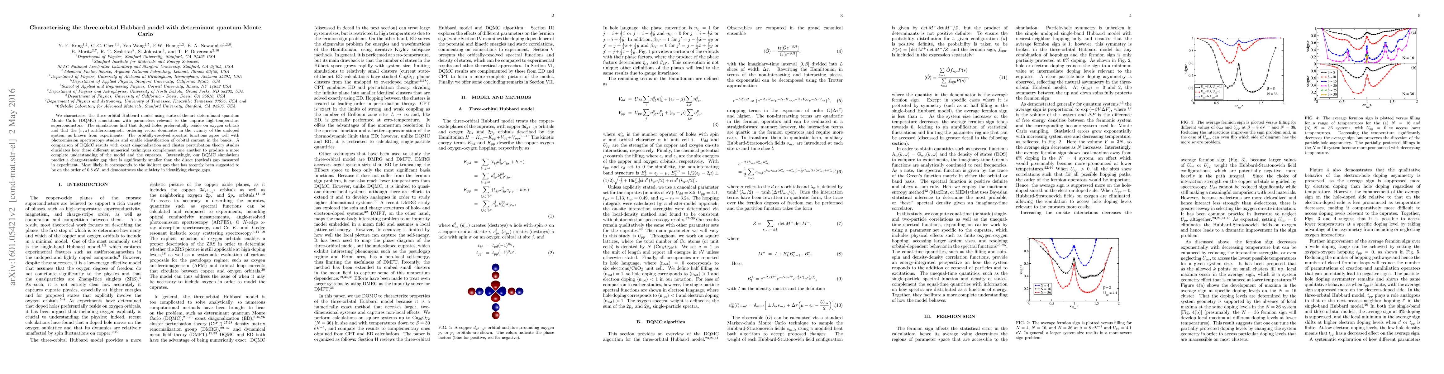 We characterize the three-orbital Hubbard model using state-of-the-art determinant quantum Monte Carlo (DQMC) simulations with parameters relevant to the cuprate high-temperature superconductors. The simulations find that doped holes preferentially reside on oxygen orbitals and that the ({\pi},{\pi}) antiferromagnetic ordering vector dominates in the vicinity of the undoped system, as known from experiments. The orbitally-resolved spectral functions agree well with photoemission spectroscopy studies and enable identification of orbital content in the bands. A comparison of DQMC results with exact diagonalization and cluster perturbation theory studies elucidates how these different numerical techniques complement one another to produce a more complete understanding of the model and the cuprates. Interestingly, our DQMC simulations predict a charge-transfer gap that is significantly smaller than the direct (optical) gap measured in experiment. Most likely, it corresponds to the indirect gap that has recently been suggested to be on the order of 0.8 eV, and demonstrates the subtlety in identifying charge gaps.