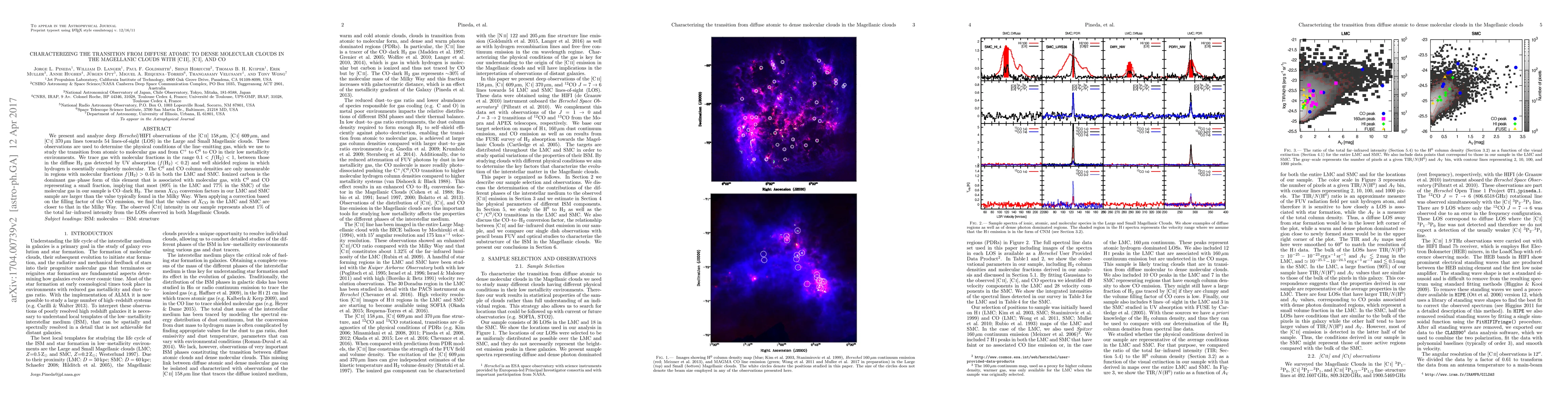 This paper analyzes Herschel/HIFI observations of [CII], [CI], and CO lines in the Magellanic Clouds to study the transition from atomic to molecular gas. It finds that most molecular gas is CO-dark, with higher X_CO conversion factors than in the Milky Way, though corrected values are closer to Milky Way values.