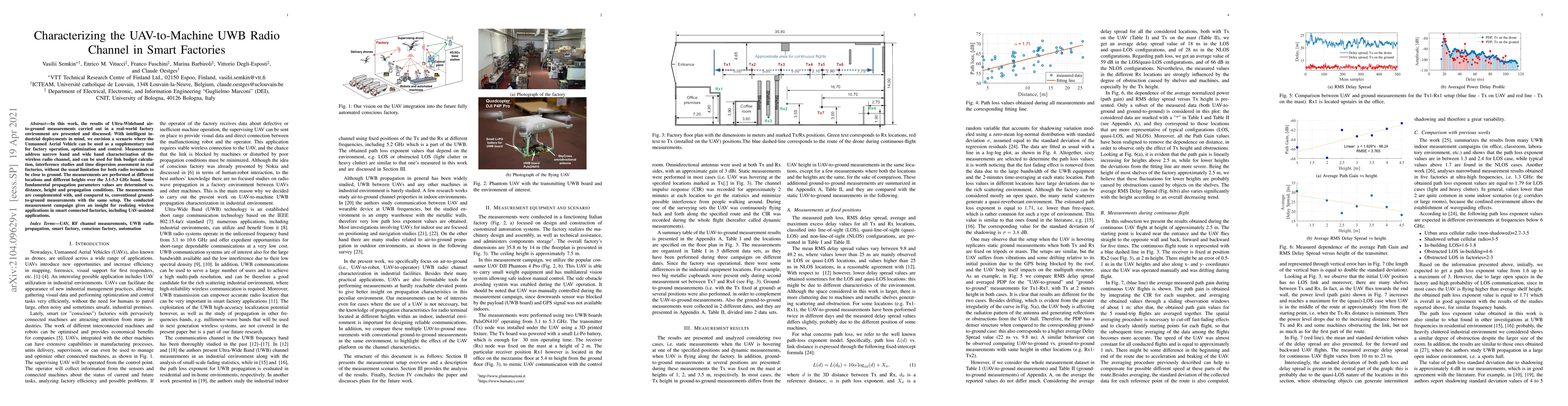 In this work, the results of Ultra-Wideband air-to-ground measurements carried out in a real-world factory environment are presented and discussed. With intelligent in-dustrial deployments in mind, we envision a scenario where the Unmanned Aerial Vehicle can be used as a supplementary tool for factory operation, optimization and control. Measurements address narrow band and wide band characterization of the wireless radio channel, and can be used for link budget calculation, interference studies and time dispersion assessment in real factories, without the usual limitation for both radio terminals to be close to ground. The measurements are performed at different locations and different heights over the 3.1-5.3 GHz band. Some fundamental propagation parameters values are determined vs. distance, height and propagation conditions. The measurements are complemented with, and compared to, conventional ground-to-ground measurements with the same setup. The conducted measurement campaign gives an insight for realizing wireless applications in smart connected factories, including UAV-assisted applications.