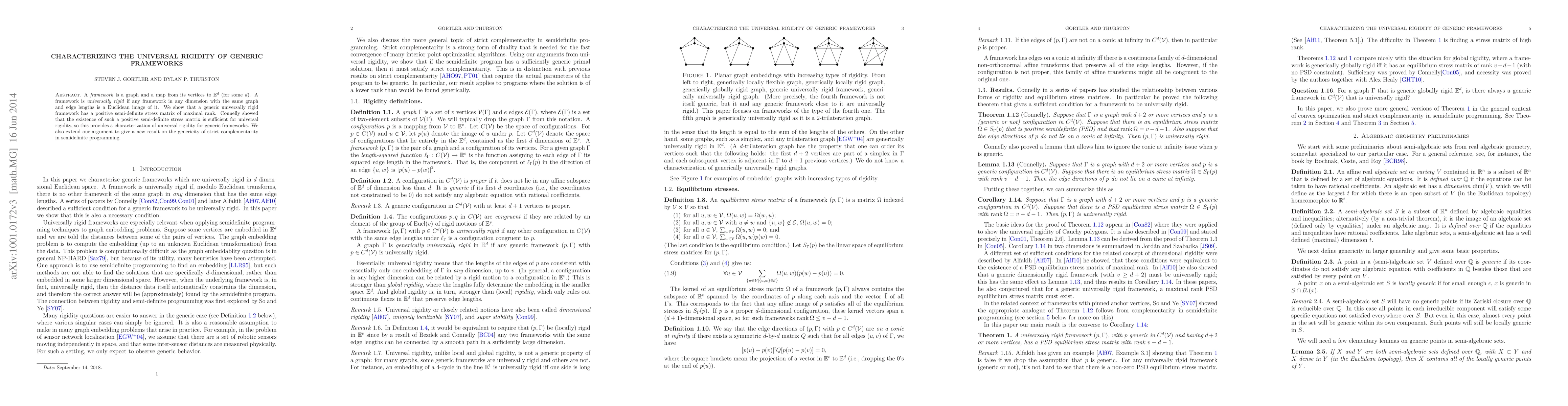 A framework is a graph and a map from its vertices to E^d (for some d). A framework is universally rigid if any framework in any dimension with the same graph and edge lengths is a Euclidean image of it. We show that a generic universally rigid framework has a positive semi-definite stress matrix of maximal rank. Connelly showed that the existence of such a positive semi-definite stress matrix is sufficient for universal rigidity, so this provides a characterization of universal rigidity for generic frameworks. We also extend our argument to give a new result on the genericity of strict complementarity in semidefinite programming.