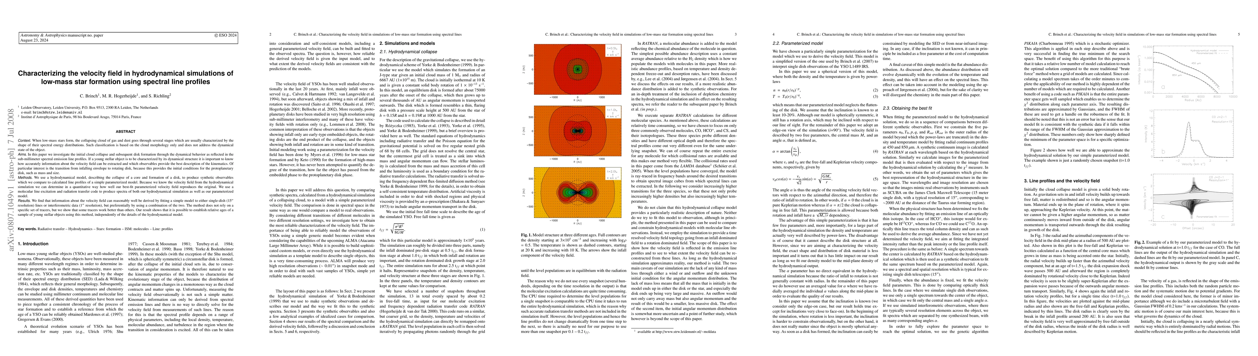 When low-mass stars form, the collapsing cloud of gas and dust goes through several stages which are usually characterized by the shape of their spectral energy distributions. Such classification is based on the cloud morphology only and does not address the dynamical state of the object. In this paper we investigate the initial cloud collapse and subsequent disk formation through the dynamical behavior as reflected in the sub-millimeter spectral emission line profiles. If a young stellar object is to be characterized by its dynamical structure it is important to know how accurately information about the velocity field can be extracted and which observables provide the best description of the kinematics. Of particular interest is the transition from infalling envelope to rotating disk, because this provides the initial conditions for the protoplanetary disk, such as mass and size. We use a hydrodynamical model, describing the collapse of a core and formation of a disk, to produce synthetic observables which we compare to calculated line profiles of a simple parameterized model. Because we know the velocity field from the hydrodynamical simulation we can determine in a quantitative way how well our best-fit parameterized velocity field reproduces the original. We use a molecular line excitation and radiation transfer code to produce spectra of both our hydro dynamical simulation as well as our parameterized model. We find that information about the velocity field can reasonably well be derived by fitting a simple model to either single-dish lines or interferometric data, but preferentially by using a combination of the two. Our result shows that it is possible to establish relative ages of a sample of young stellar objects using this method, independently of the details of the hydrodynamical model.