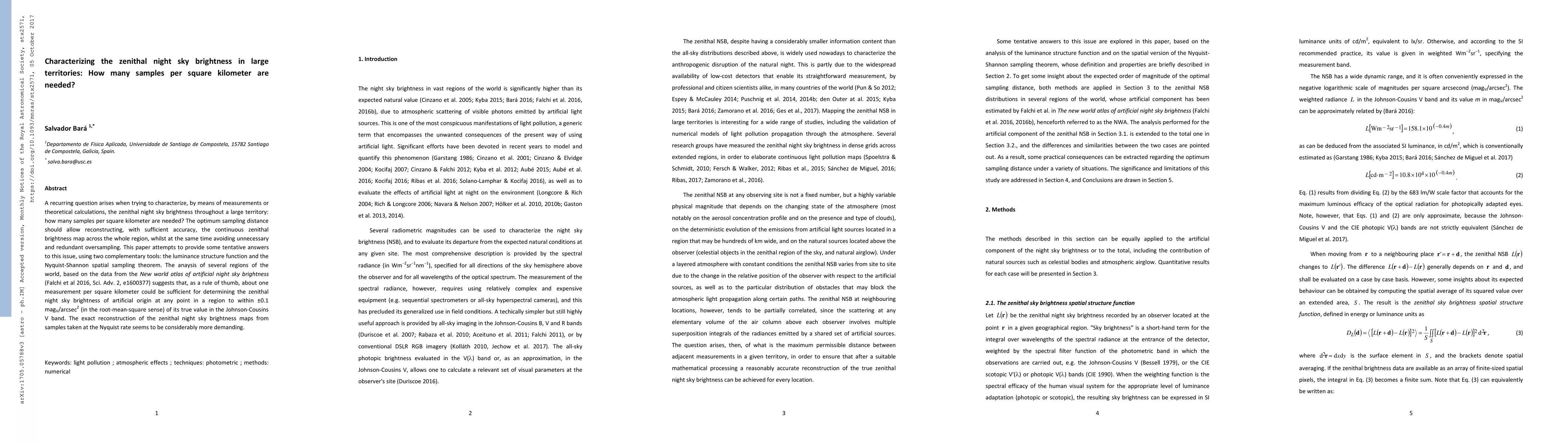 This paper investigates the optimal sampling distance for characterizing zenithal night sky brightness across large territories, suggesting that one measurement per square kilometer is typically sufficient for accurate estimations. The study employs the luminance structure function and the Nyquist-Shannon theorem, concluding that exact reconstruction requires more stringent sampling.